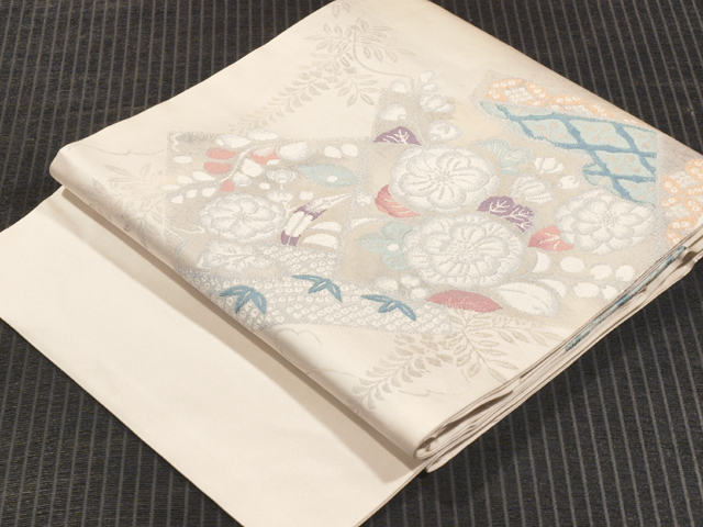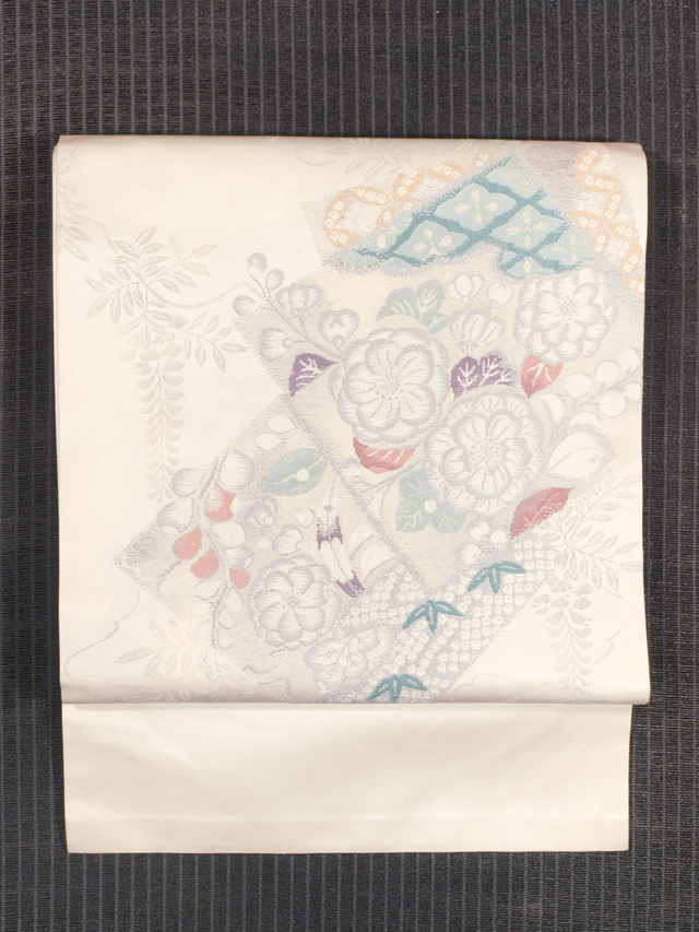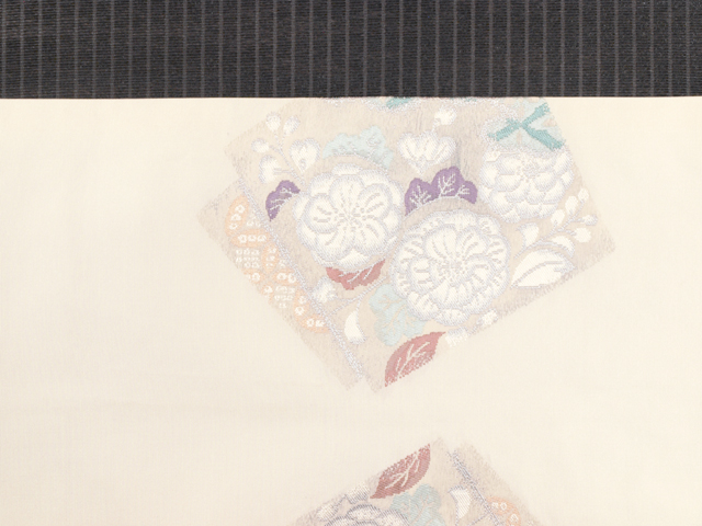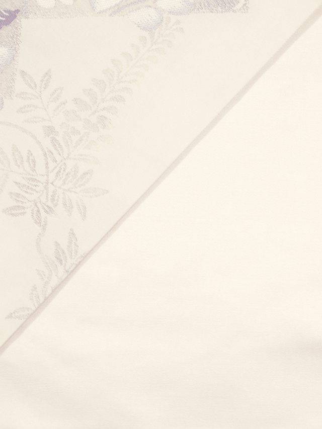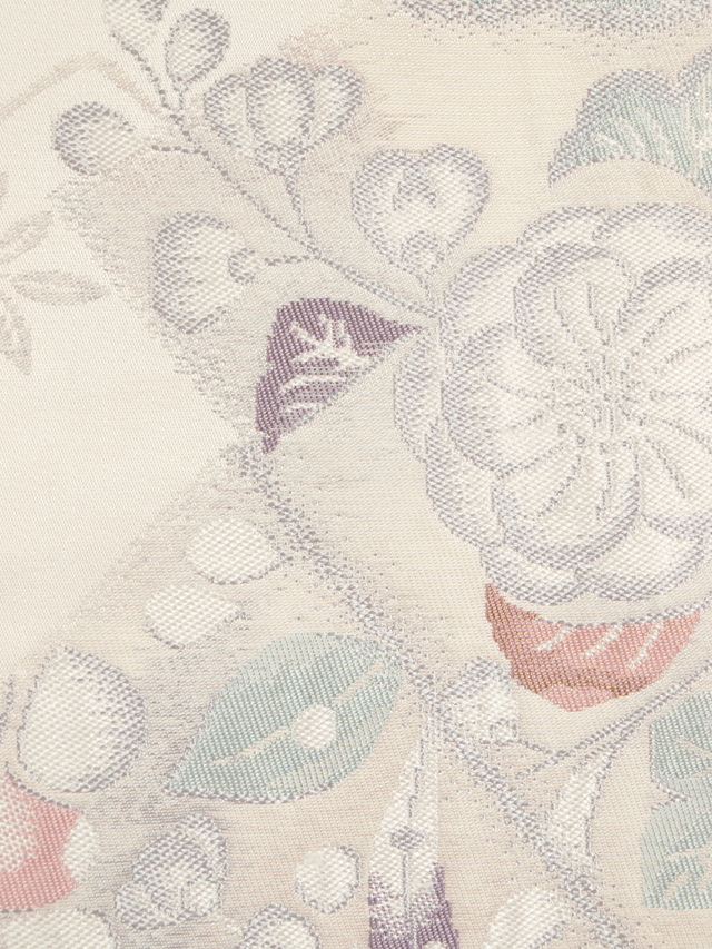 わずかにきなり色がかった白色の地に、辻が花の配された角と藤の文様が織り込まれている、西陣織の名古屋帯です。 とてもはかなげで、透明感の感じられる、洗練された上品な意匠です。胴回り部が開いたままで裏地がなく、帯芯が見えている「東京仕立て」になっています。 ユーズド品で、前の折り跡と結びジワがうっすらとあるほか、お太鼓の裏に回る部分と裏地に直径約 0.5mm のごくこまかなよごれやごくこまかなキズが数か所ありますが、使用感もそれほど感じられず、気にはなりません。淡いお色目のため、ごくこまかなくすみなどはあるかもしれませんが、目につくしみやよごれ、褪色などのダメージはなく、全体的にはきれいな状態です。 |