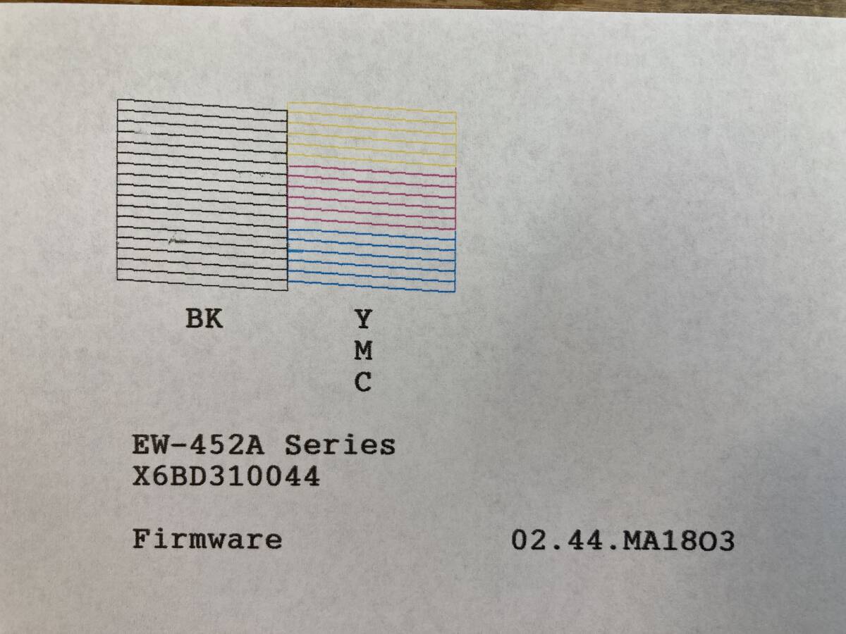 ノズルチェック、A4モノクロカラーコピーの確認を行っております。