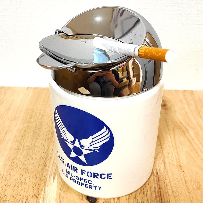商品説明 | 【ドームアシュトレイ AIR FORCE】 U.S.エアフォース(アメリカ空軍)のドーム型の陶器製灰皿です。 蓋が半回転してレストになり、蓋を戻せば中に吸い殻や灰が落ちる仕組みです。風で燃えかすが飛んだりする心配もなく安心してお使いいただけます。 フロントにはU.S.エアフォースのエンブレムがデザインされています。 しっかりと重みのある陶器製で、水洗いもでき、お手入れや掃除が簡単にできます。 灰皿としてはもちろん、小物入れとしてもお使いいただけます。 愛煙者へののちょっとしたプレゼントやにもいかがでしょうか。 |