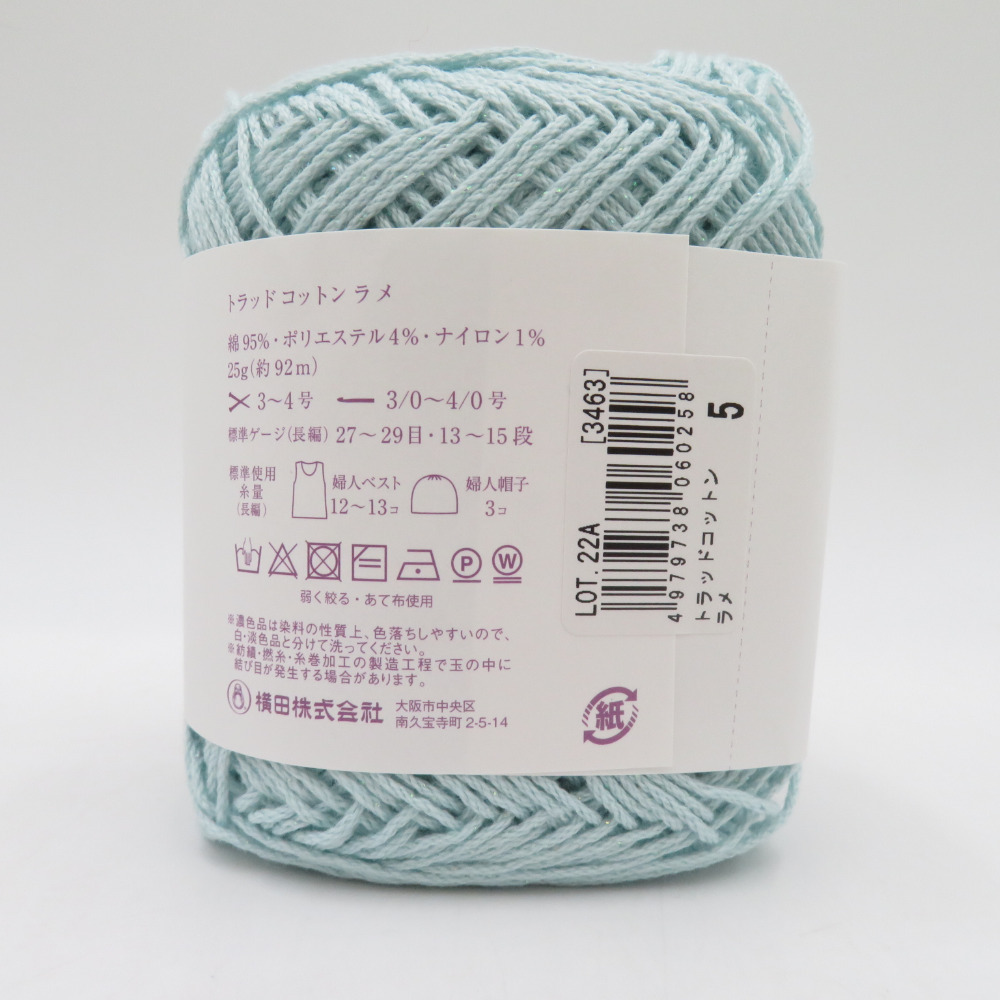 | 商品説明 | 横田株式会社のサマーヤーン『トラッドコットン ラメ』。 日本製の良質なコットン糸です。 なめらかでやわらかいさわり心地のラメタイプです。 ほんのりと入ったオーロララメがポイントです。 マットで落ち着いたトーンと組み合わせやすいカラーバリエーションです。 【3463】トラッドコットン ラメ ■仕立:重さ 約25g 長さ 約92m 中細 ■棒針3~4号・かぎ針3/0~4/0号 標準ゲージ 27~29目・13~15段 | ||