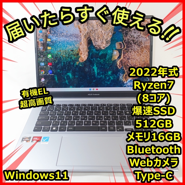 2022年式 超高画質 有機EL Ryzen 7(8コア) Windows11 爆速SSD512GB メモリ16GB サクサク♪Asus Vivobook ウェブカメラ Bluetooth 管番702