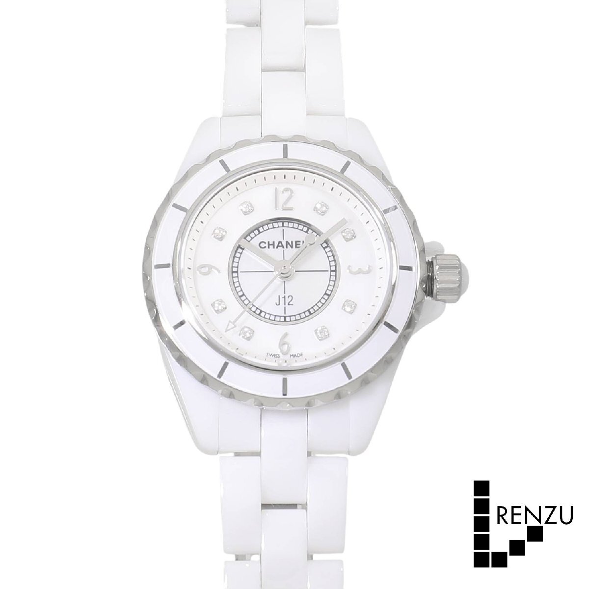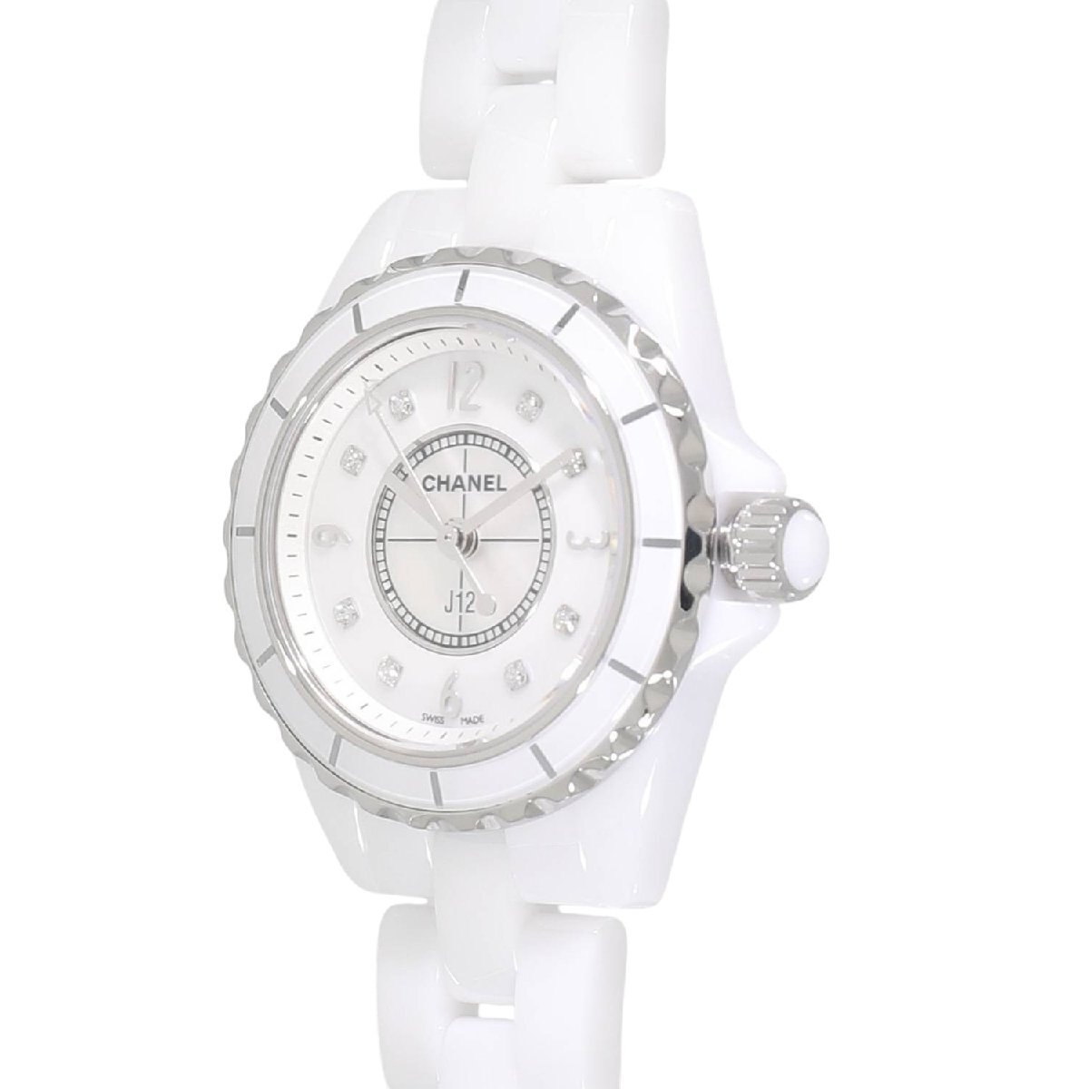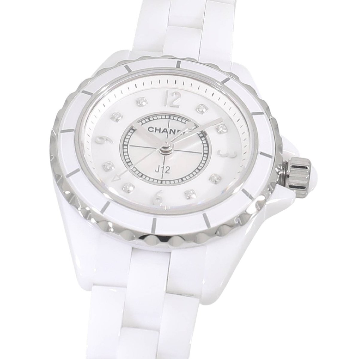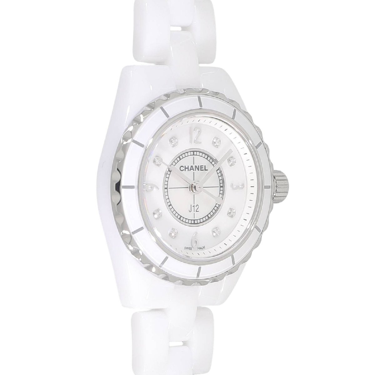 | モデルについて | 2000年に発売されて以来、その人気が衰える事を知らないJ12。ココ・シャネルの名言として広く知られる『黒にはすべてがある。白も同じ。その美しさは絶対的なもの。それが完璧なハーモニー。』という言葉通り、ブラックとホワイトのセラミックを数多く採用するシャネルタイムピースのアイコン的存在です。白と黒はどんな装いにも合わせやすく、季節やシーンを問わずご使用いただけます。今日、多くの時計にセラミックが使われることになった、きっかけとなったモデルと言っても過言ではありません。29ミリと小ぶりなサイズとなり、よりフェミニンさが際立つモデルになります。インデックスには8個のダイヤモンドがセットされています。 |