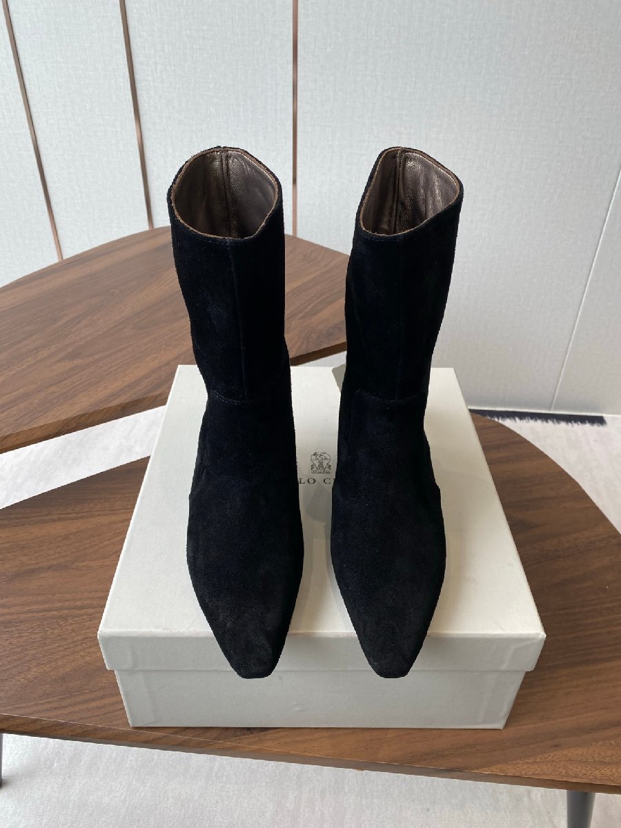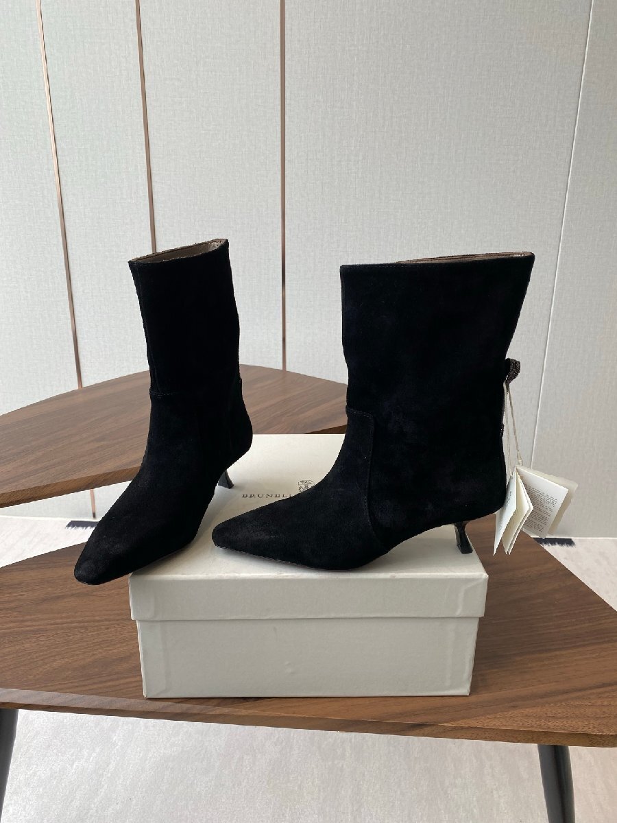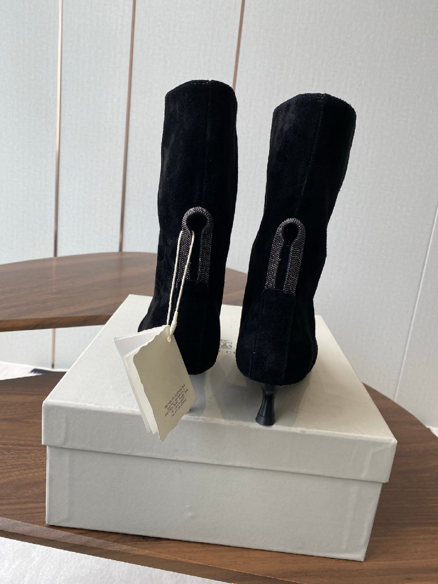 上質なスエードレザーを使用した、エレガントなポインテッドトゥのショートブーツです。ブルネロ・クチネリならではの洗練されたデザインと、職人技が光ります。スタイリッシュなキトンヒールは、歩きやすさと美しさを両立。上質な羊皮を内張りに使用し、快適な履き心地を実現しています。本革ソールは耐久性に優れ、長くご愛用いただけます。シックなブラックカラーは、様々なスタイリングに合わせやすく、オフィスからお出かけまで幅広いシーンで活躍します。秋冬コレクションの一品として、洗練された大人の女性の足元を演出します。確かな品質と、時代を超えて愛されるデザインを兼ね備えた一足です。