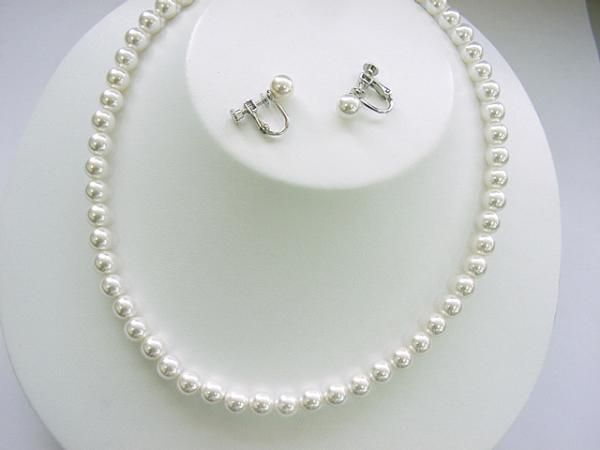 | ◆素材 : 貝パール 8mm珠(ホワイト) ◆本体材質 : クラスプ・イヤリング金具の材質 : 真鍮(ロジュウム仕上) ◆サイズ : 長さ=約43cm ◆イヤリング:スクリュー式(スプリング付) |