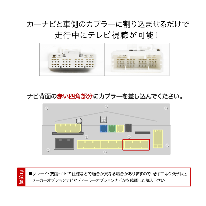 | 走行中にテレビ視聴が可能に! ・走行中のナビ操作(目的地の設定等):可能 ・テレビ視聴時のナビ現在地:自車位置ズレない ・適合ナビ:9インチディスプレーオーディオ専用(JBLプレミアム装備車は適合不可) 【確認事項】 ※JBLプレミアム装備車は適合不可 ※ナビ機能はエントリーナビキットまたはT-Connectナビキットが必要 ※取扱説明書なし |