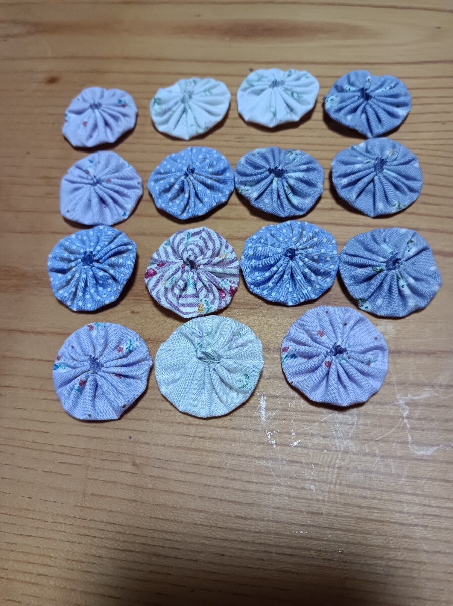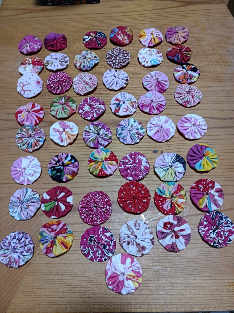 5年程前に 何か作ろうと思って作成しました。 ヨーヨーキルト サイズ 直径 大 約4.2cm 中 約3.2cm 小 約2.7cm です。 手作りの袋などつけてもかわいいです。使っていただいたら幸いです。