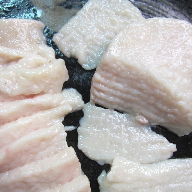 タテガミの部分で、見た目は真っ白な刺身ですがコラーゲンを多く含み、美容にもよい部分です。