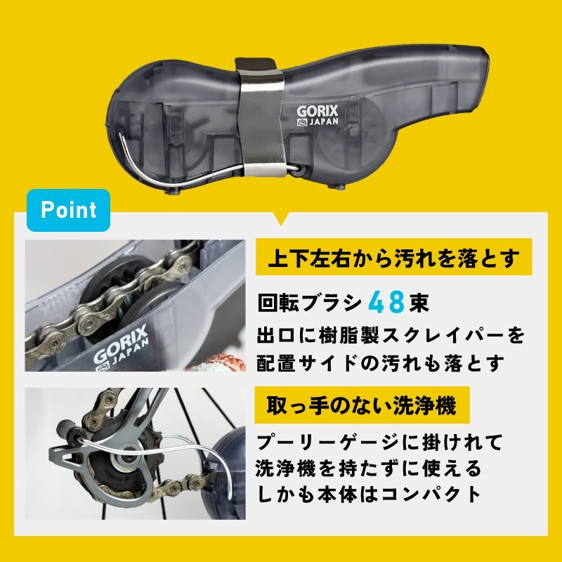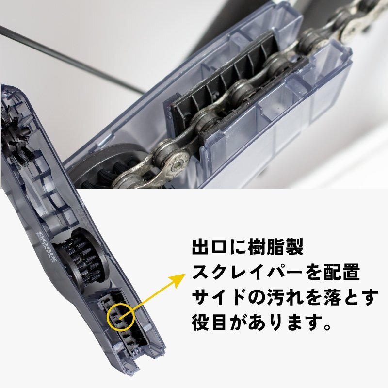 ロードバイク・マウンテンバイク・クロスバイクのメンテナンスに最適なチェーンクリーナーです。 本体内には回転する48本のブラシを内蔵。チェーンの動きに合わせて上下左右から汚れをかき出します。 洗浄液を本体内に注ぎプーリーケージに掛けフタを閉めて、スチール帯をしたら準備完了です。 クランクを回すだけで洗浄液のしみこんだブラシがチェーンをゴシゴシと洗います。 使用後はブラシを水ですすぎ、乾燥させておけば繰り返し使用することができます。 極力手を汚さずに行えるチェーン洗浄です。 ※チェーン洗浄を終えたら最後に必ずチェーンオイルを挿して下さい。 このチェーンクリーナー洗浄機の特徴は ・洗浄機を持たずに使える(プーリーケージに掛けれる) ・少ない量の洗浄液で使える。(約30ml) ・回転ブラシが48本(ゴシゴシ汚れを落とす) ・出口に樹脂製スクレイパーを配置されていてサイドの汚れもしっかり落ちる。 商品内容チェーンクリーナー洗浄機 材質ABS、スチール サイズW18×H6×D2.5cm | |
