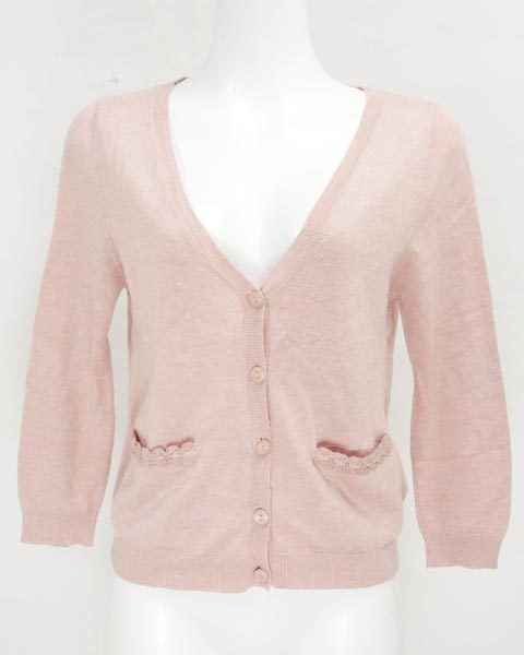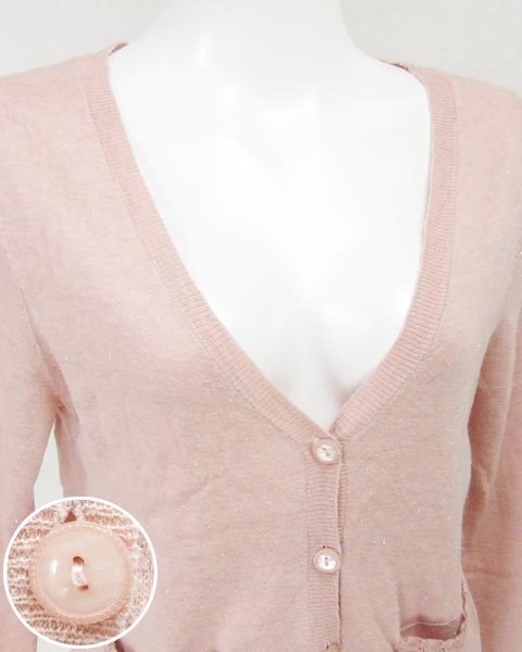 | 少しラメ糸の入った可愛らしいカーディガンポケット部分はテープでトリミングデザインされています薄手の素材で長いシーズンお使いいただけるアイテム素材の特性上、毛羽立ちがみられます。 |