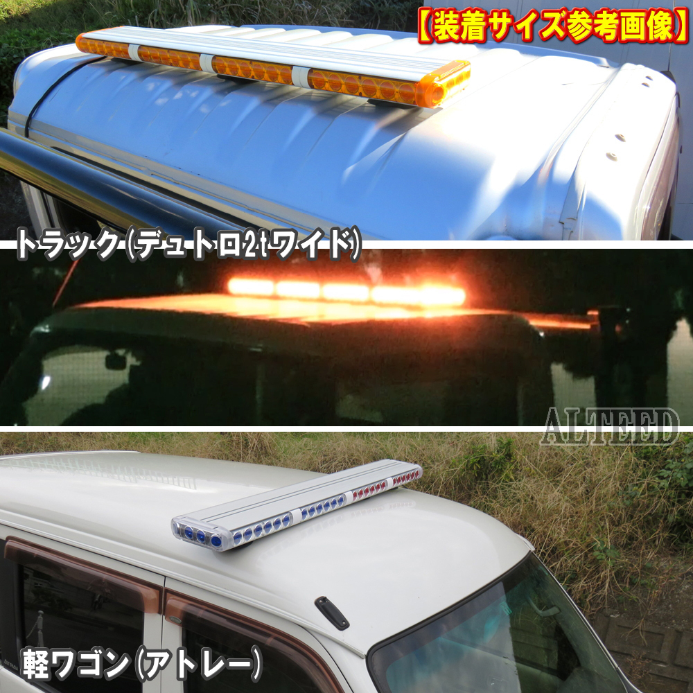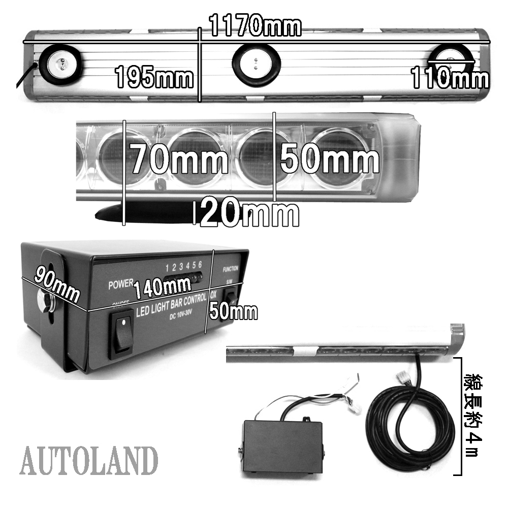 | 作動パターン:点滅、回転、流動等8種類。※動画をご参照下さい。 サイズ:1170×195×50mm ※商品画像内に詳細記載 コード長(本体~コントロールボックス):約4m コード径:約7mm 質量:約5kg 対応電圧:DC10-30V 消費電流(平均):12V-1.8A/24V-0.9A 定格消費電力:56W 防水防塵規格:IP67 付属品:ネオジウムマグネットステー×3個、固定ステー×2個 主素材:アルミダイカスト/ポリカーボネイト/スチール/ネオジウムマグネット EMC規格認証:ECE R10 【取付について】 マグネットステー、固定ステーの取付幅は調整可能です。 固定ステーはルーフ面110cm程度までの対応となり、トラック等には加工無しでのご使用いただけません。また、ルーフ幅が適合していてもフックを掛ける箇所へのルーフ面からの厚みによりご使用いただけない場合があります。マグネットステー装着を主とした商品となり、固定ステーは加工用付属品となります。 本体からコントロールボックスへの車内引き込みコードは太さ7mmとなります。 |