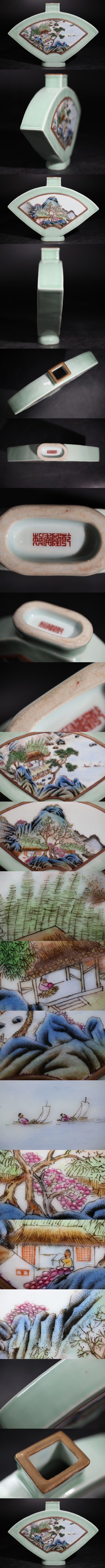 | 乾隆年製 底款 色絵 青磁 墨彩 風景図 扇型 徳利 / 清 乾隆 中国美術 酒器 煎茶道具 .G3072 |