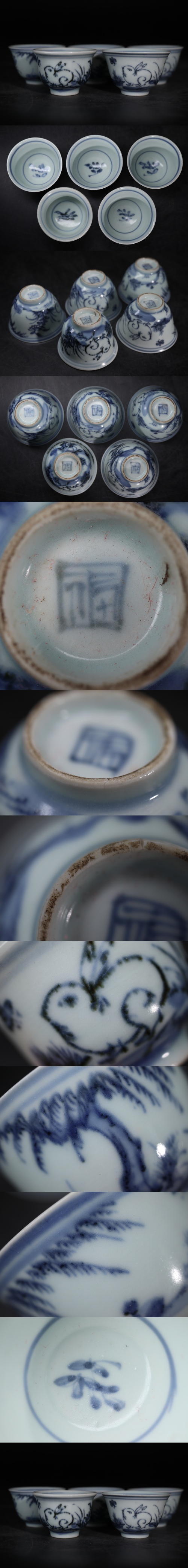 | 時代 古伊万里 染付 角福 兎紋 煎茶碗 五客 / 伊万里 有田 茶器 煎茶道具 煎茶飾 .G3353 |