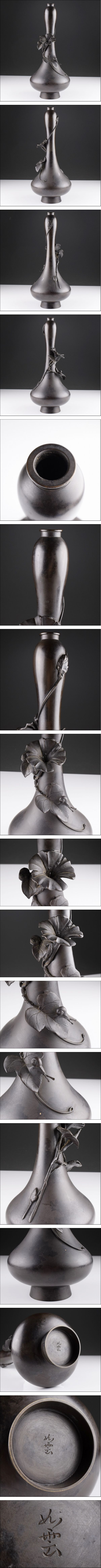| 品 名:金工師 大島如雲 造 銅製 蝸牛朝顔細工 瓢形 花瓶 高さ30.5㎝ 寸 法:高さ 30.5㎝ 直径 13.5㎝ 総重量:1238g 状 態:経年による汚れあり。 | |||