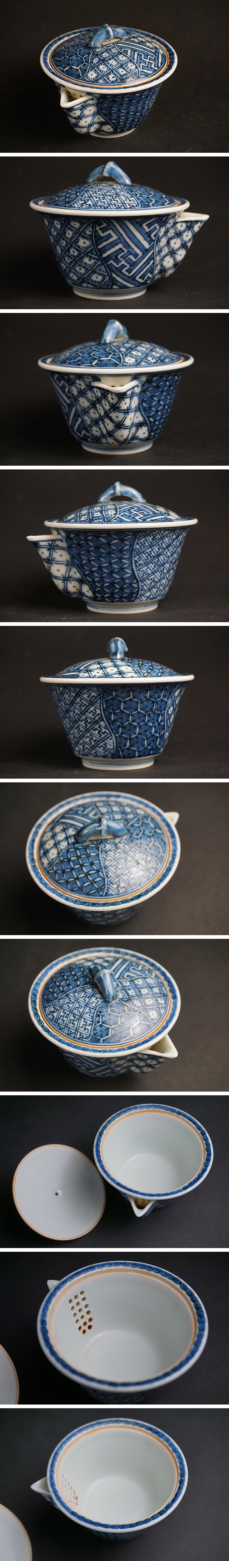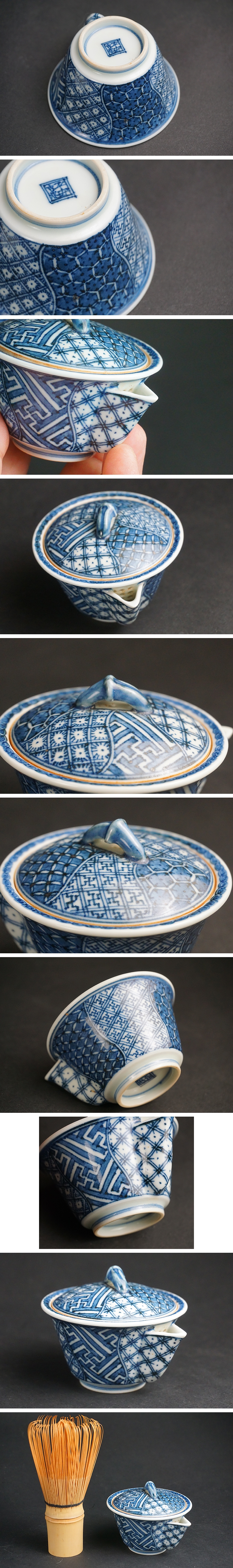 平安吉兆 祥瑞染付急須です。 急須のみとなります。少々茶葉痕が注ぎ口に残ります。 大きな傷はありません。画像ご参考の上ご入札ください。 重さ97g 高さ4.5cm 高さ摘みまで6.3cm 口径7.3cm 高台径3.4cm | |||
