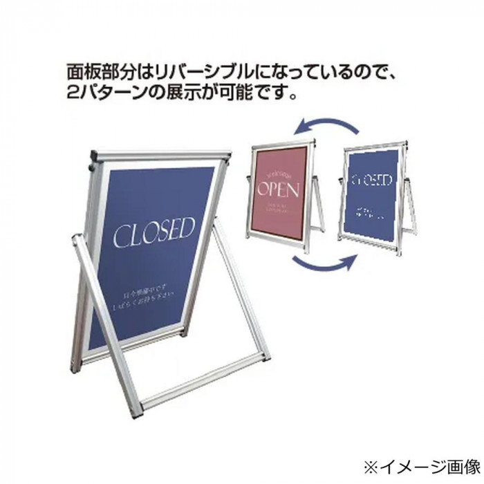 | ワンタッチでコンパクトに収納できる組立不要の屋外対応スタンドです。 ※屋内・屋外可(ポスターには耐水加工が必要です) ※片面・両面(リバーシブル仕様) |
