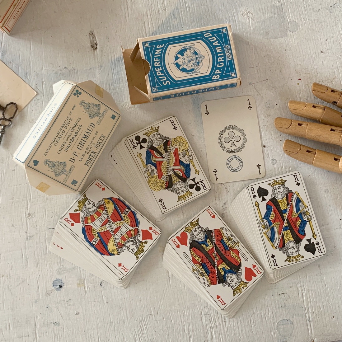 PayPayフリマからご覧のお客様 説明欄に追加画像を掲載している商品がございます PayPayフリマからではご覧いただけません の『商品詳細を見る』から追加画像をご確認ください 表示価格は、箱入りトランプ1セットの価格です フランス パリ 1930-50s デッドストック B.P GRIMAUD トランプ デッキ 包み紙、箱付き 新品ですので全てのカード四つ角にシルバーのペイントが残っています 大変良いコンディションです 箱入りトランプ1セットの価格です サイズ:9cm×5.8cm×2cm 他にも多数出品していますので是非ご覧ください ホームページもございますので、よろしければご覧ください -------------------------------------------------------------------------------------------------- ・古物と十分ご理解の上落札をお願いします ・撮影に使われているその他小物はお取引に含まれません ・新規の方は入札前に質問欄からお問い合わせ下さい ・落札後のキャンセル、返品(クレーム)はご遠慮ください ・割引販売、梱包方法の指定はご遠慮ください ・画面と実物の色味の違い、サイズの若干誤差などが生じる場合がございます ・状態を全て掲載、記載する事は難しく、気になる点は事前に必ずご質問下さい ※状態とは( 痕、傷、汚れ、シミ、ホツレ、錆、ひび割れ等) -------------------------------------------------------------------------------------------------- |