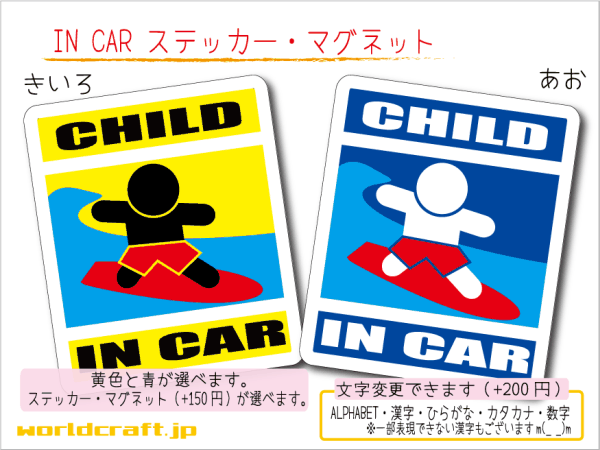 クルマのうしろにペタリとどうぞ!! ●サイズ : 縦 10.5cm × 横 9cm ●枚数 : 1枚 ■ 仕様選択 : ■ カラー選択 : 黄色 / 青 ☆仕様とカラー、それぞれどちらかひとつ お選びください☆ 画像1にはマグネット仕様+150円と書かれていますが、 このたびステッカーと同じ価格になりました☆ 現在マグネット仕様に追加料金はございません 落札後、取引ナビにて ご希望の仕様(ステッカー / マグネット)、ご希望カラー(黄色 / 青) をお知らせくださいませ ★ 耐久性UPしました ★ 耐水・耐候 屋外用塩ビシート仕様 ☆当店だけでしか買えないオリジナルデザイン☆ Made in JAPAN □ □ □ □ □ □ □ □ □ □ □ □ □ □ □ □ □ □ □ BABY IN CAR、BABY on BOARD、CHILD IN CAR、CHILD on BOARDバージョン、その他スノボバージョン、スケボーバージョン、野球バージョンなどなどいろんなバージョンいっぱい取りそろえております☆ ☆その他 出品中の○○ IN CAR ステッカーシリーズ☆ ・BABY IN CARステッカー ・CHILD IN CARステッカー ・○○ IN CARステッカー(大人バージョン) ☆もうひとつのオークションID i306st でも BABY CHILDステッカー出品中☆ BABY ・ CHILD ☆どうぞよろしくお願いいたします☆ ※お休みの連絡などある場合がございますので、ご入札前に必ず自己紹介欄をご覧くださいませ※