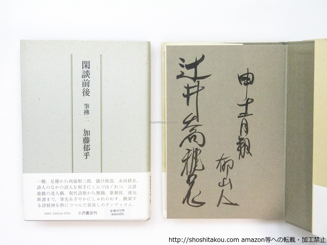 古意新見・閑談前後 筆拂1・2 2冊揃 辻井喬宛毛筆署名入 / 加藤郁乎 ◯当店在庫から「加藤郁乎」の本を探す| ★ 発送方法 (送料無料) ・日本郵便のゆうパケット・レターパックライト・レターパックプラス・ゆうパックの中から荷姿の大きさに適した方法で発送します。(発送方法や到着日時はご指定いただけません。) ・上記発送方法はすべて追跡番号付き・土日配送有・速達扱いです。ゆうメールや定形外は発送に使用いたしません。 ・ゆうパケット・レターパックライトは郵便受けにお届け、レターパックプラス・ゆうパックは配達員対面受取です。防水梱包します。 ★ 必ずお読みください ・代金決済後の次の火木土に発送します。 ・ストア出品です。ご注文時に必要事項のご記入・決済いただいた後は、やり取り不要です。商品の到着をお待ち下さい。 ・肉筆物・美術作品は真作保証いたします。 ・商品のレファレンス(調べ物)サービスは行っておりません。また当店商品以外の無料鑑定は行っておりません。 |