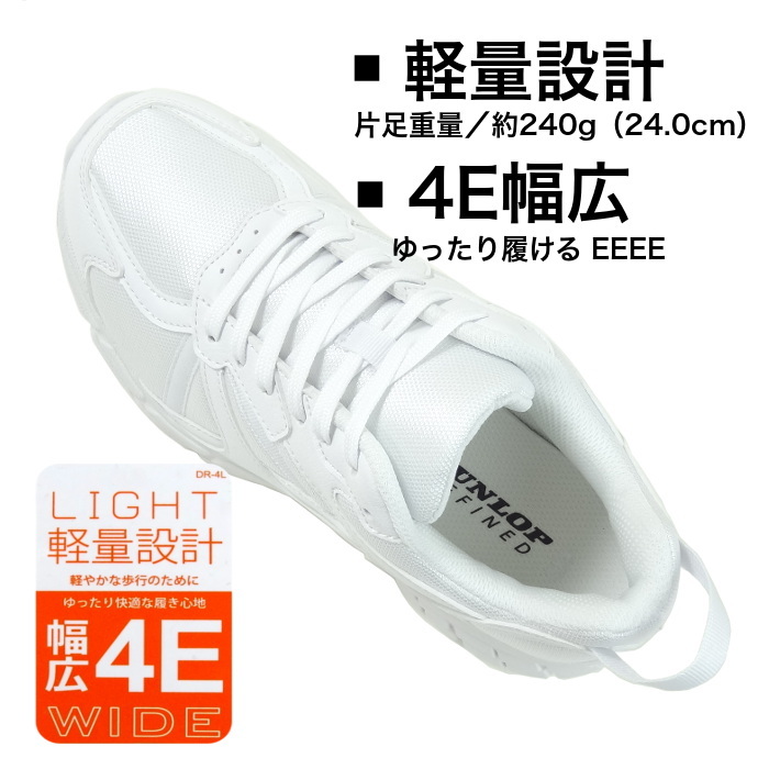 ブランド名:DUNLOP REFINED 品名:M2011 品番:DM2011 色:ホワイト 靴の幅:4E EEEE サイズ:23.0cm 素材: アッパー/合成皮革+合成繊維 ソール/EVA+TPR 生産国:中国 ・軽量設計/軽い素材であるEVAなどを靴底に仕様し軽量化しています。 ・屈曲性/屈曲性を重視した靴底設計により足にフィットしやすくなっています。 ・撥水機能/アッパーのメッシュ部分に撥水加工をしております。(防水ではありません。素材の縫い目などから水が侵入する場合があります) 男女兼用、ダンロップの軽量ランニングシューズです。学生さんのスクールシューズや普段履きから施設や病院などのお仕事用、ランニング、ウォーキングなどさまざまな用途にご使用いただけます。 お気軽なプレゼントや贈り物などにもおすすめです! | ||