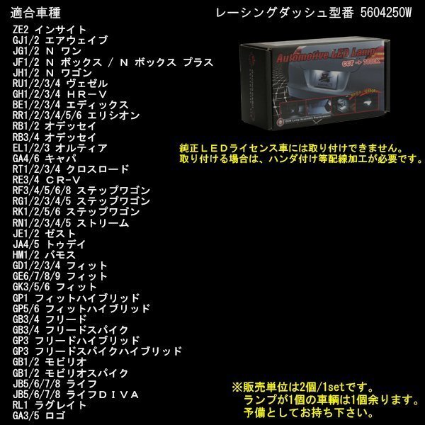 純正のライセンスランプをユニットごと交換する車種別専用設計品! カプラーオンで装着できLEDを可能な限り配置していますのでバルブ交換では実現できない高照度を実現! 色温度も約7000Kの純白で愛車のリアビューをスタイリッシュに演出します。 お届け日より安心の3か月保証付きです。 その他、レーシングダッシュ製品は⇒ こちら | ■ レーシングダッシュ型番:5604250W ■ 動作電圧:DC12V ■ 保証期間:到着日より3か月間 ■ 色温度:約7000K ■ 入数:2個セット 純正品と同様の結露の発生や少量の水滴の侵入、お客様の取り扱い上による破損及び加工改造等を行った物は保証対象外です。 保証はあくまで製品本体の保証であって、取付け工賃や製品使用から生じたいかなる損害に関しては当店は一切の責任は負いません。 | |