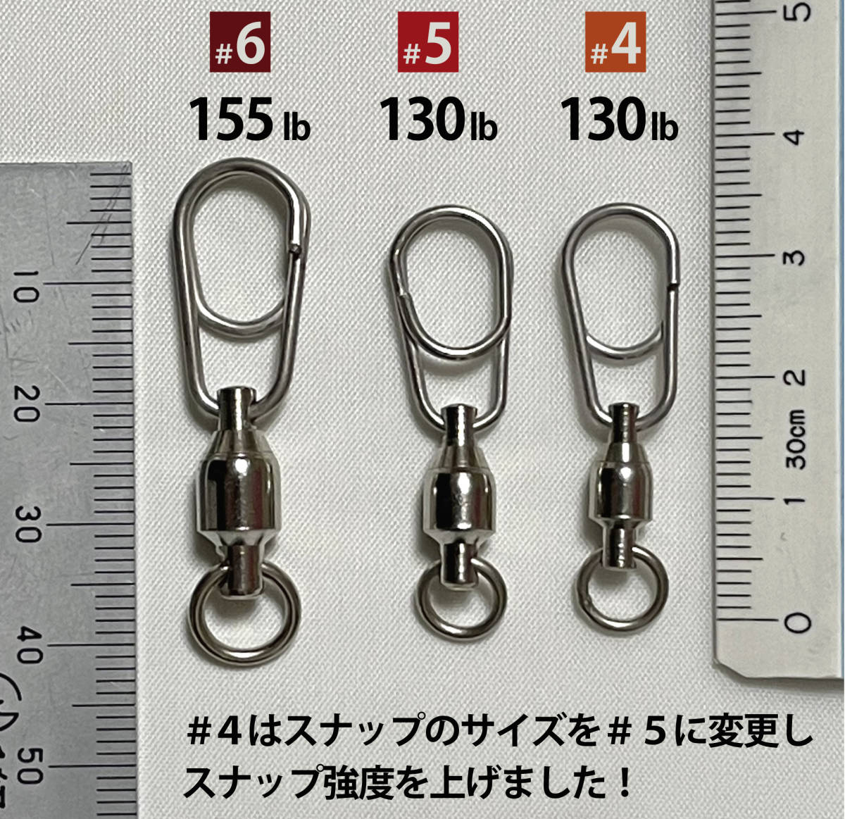 オーシャンスナップと同じ形のスナップを 高回転ベアリングスイベルに装備しております。 この商品は一番強度が弱くなるスナップ部を 一段階大きい物(#5)に変更しております。 サイズは3種類ご用意しております。 ベアリングスイベルは数社から仕入れ、質の良い物を選んでいます。