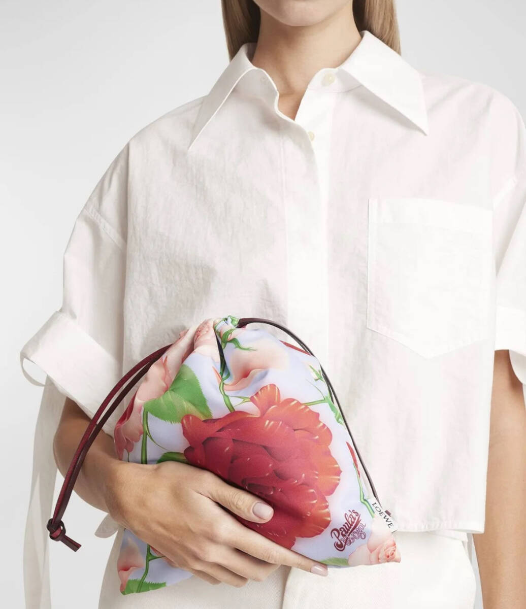 ロエベらしいアート感と上品さが詰まった、ローズ柄のドローストリングポーチ。