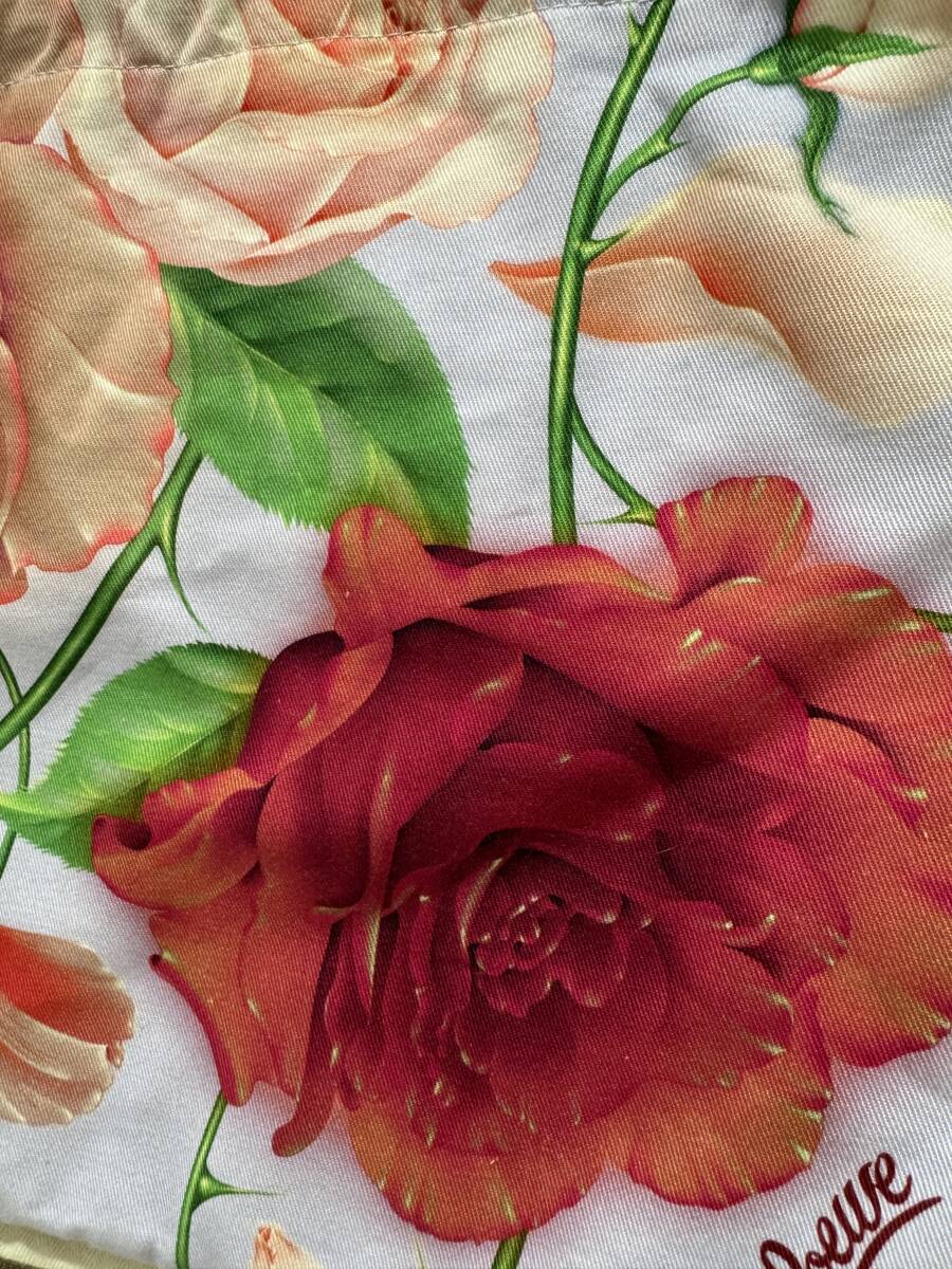 淡いラベンダーカラーに咲き誇るバラのプリントが美しく、持つだけで気分が上がるアイテムです。