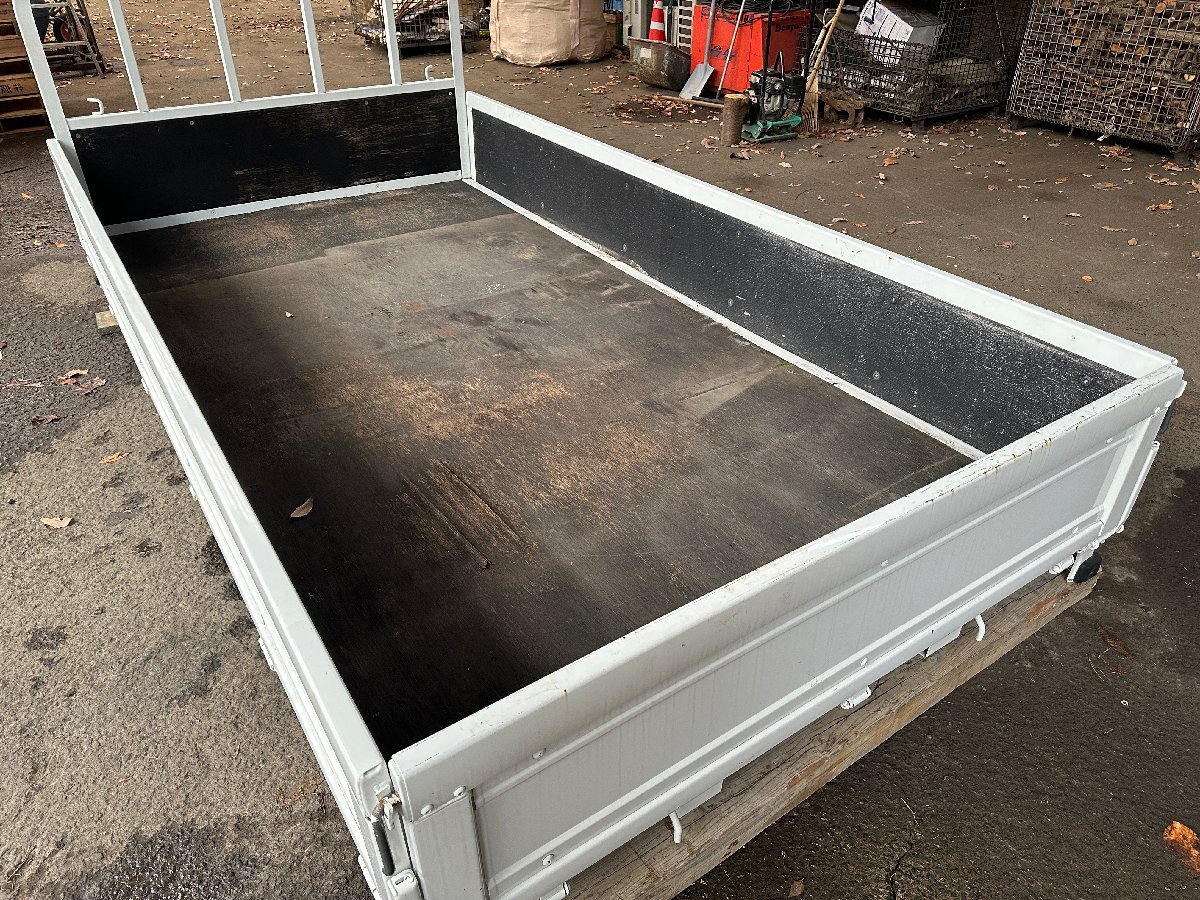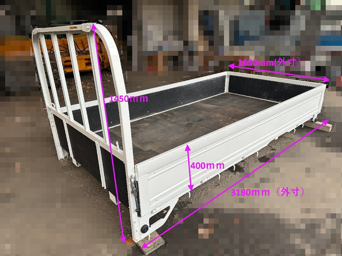 | 商品説明 | 2t 平ボディ 3方開タイプの荷台です。 中古品になります。 商品詳細 縦根太の無いタイプです *メーカー: 不明 *外寸サイズ; 長さ 3180mm 幅1690mm *横根太に付いている取付土台の寸法;外寸925mm、内寸725mm *アオリ部の高さ 400mm *各寸法は画像を参照して下さい。 状態 *全体に擦傷、凹、錆が多少あります *床板 老けあります *写真もご覧下さい ※適合は面倒でも各自で確認をお願いします。 使用に伴う傷や汚れなどあります。 あくまで中古品です。状態の判断には個人差がありますので、商品の状態は画像でご確認ください。 この商品の送料はお問合せください。 西濃運輸様のチャーター便となりますので、郵便番号をお知らせ下さい。 また、お問い合わせの際は事業所のみとさせて頂きます。 ※わからない事がありましたら、質問からお問い合わせ下さい。 |