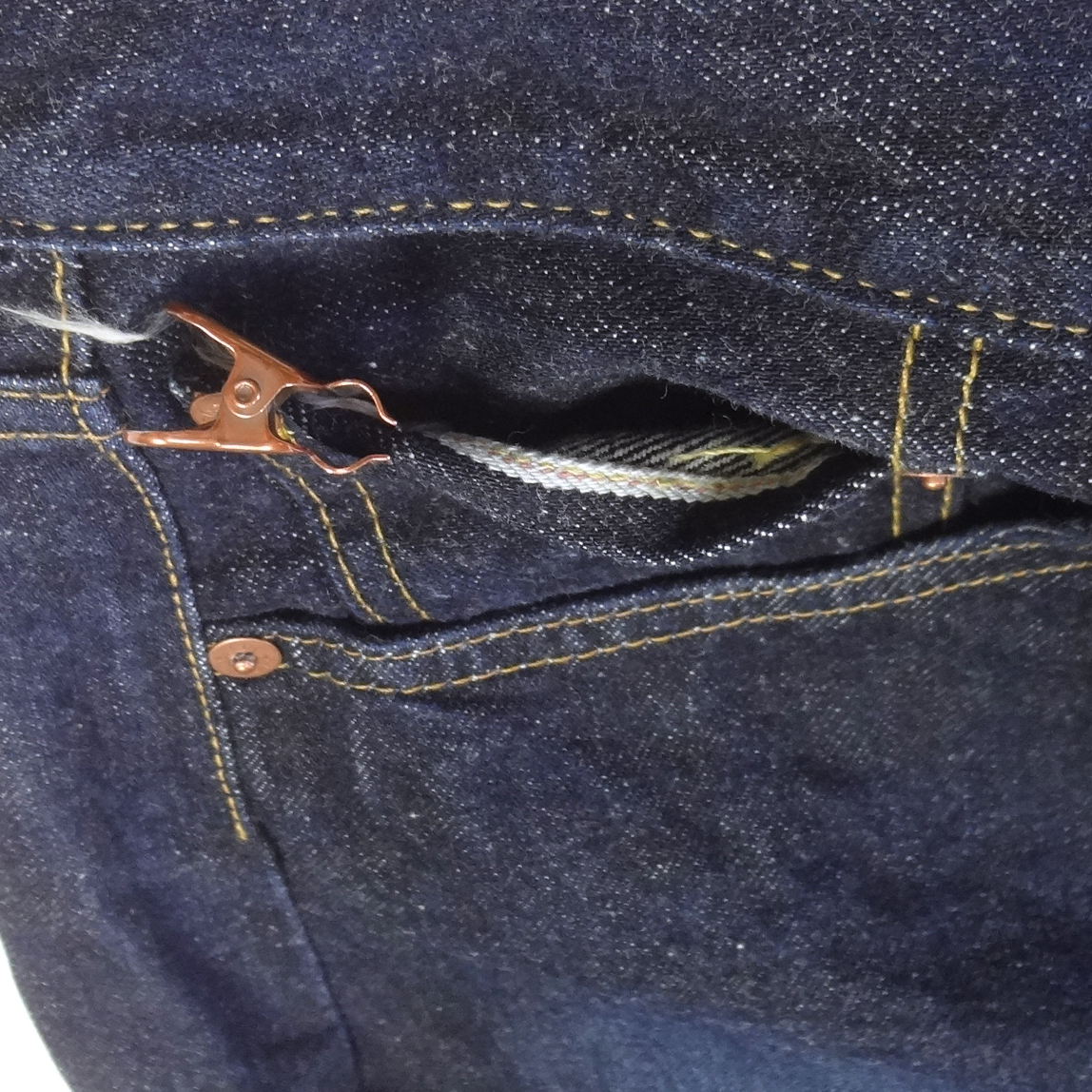 ・ビックEレッドタブ、アーキュエットステッチ、ボタンフライ、5ポケットリベット、ペーパーパッチ、トップボタン裏刻印555、V字ステッチ補強、隠しリベット、赤耳デニム、コインポケット裏赤耳