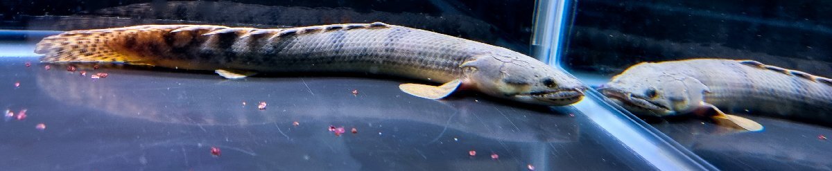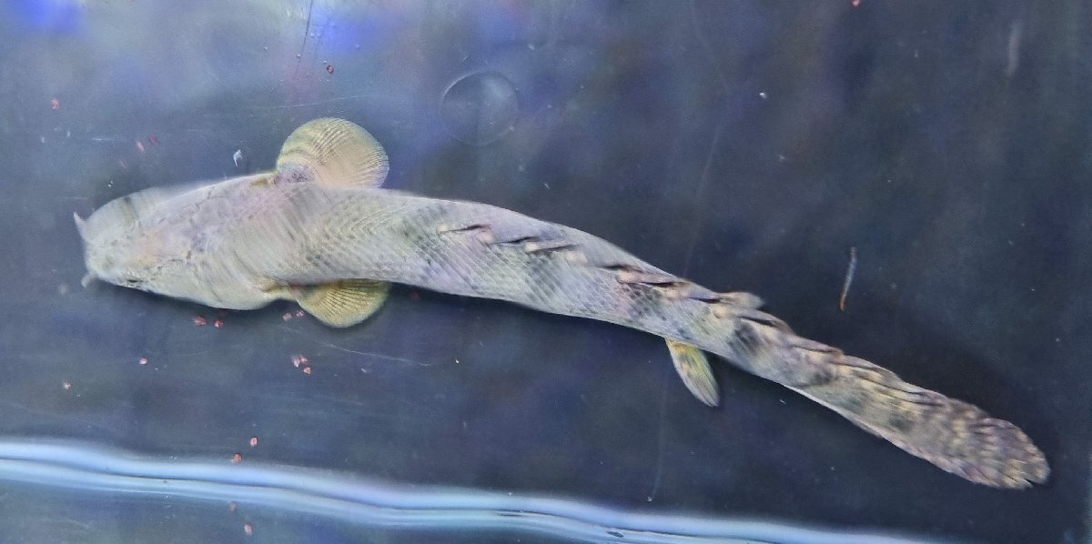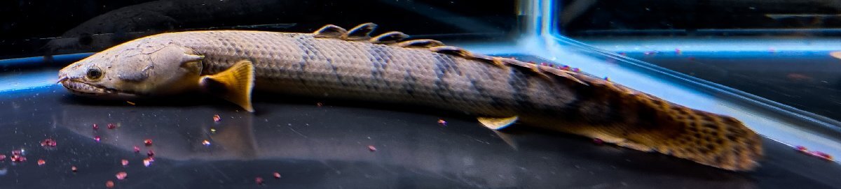 ポリプテルスウィークシーは茶褐色のボディーに薄いバンド模様が入り大きな頭部の寸胴体系のポリプテルスです。他のポリプテルスに比べ短い背鰭を持ち背鰭の数は9~11本と少ないです。