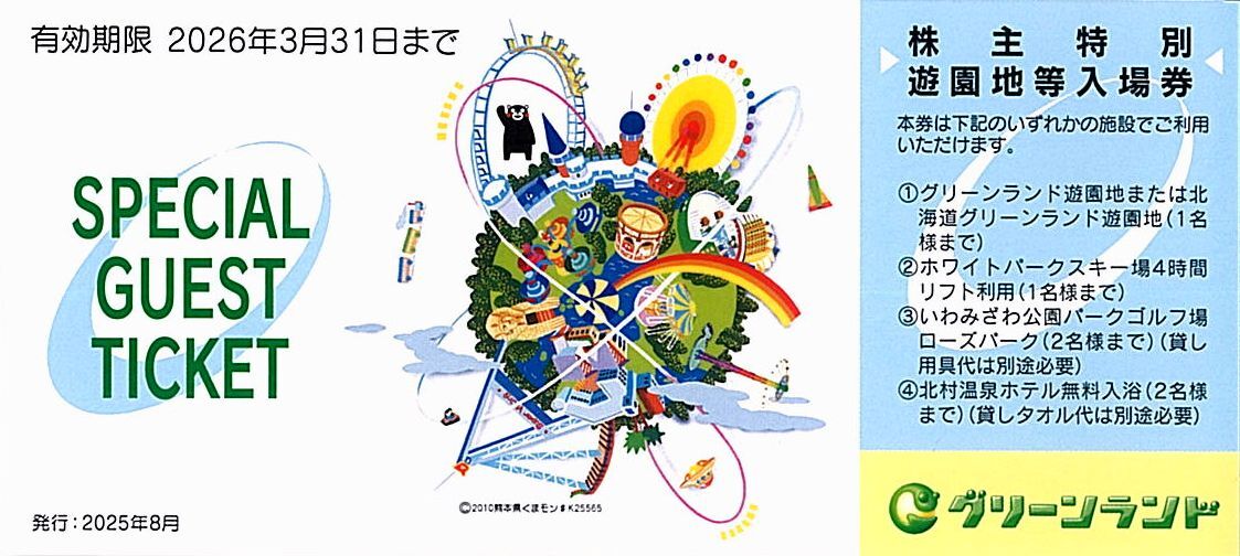 有効期限は「2026年3月31日」です。 本券1枚で、下記のいずれかの施設でご利用いただけます。 1,グリーンランド遊園地または北海道グリーンランド遊園地(1名様まで) 2,ホワイトパークスキー場4時間リフト利用(1名様まで) 3,いわみざわ公園パークゴルフ場ローズパーク(2名様まで)(貸し用具代は別途必要) 4,北村温泉ホテル無料入浴(2名様まで)(貸しタオル代は別途必要 ※詳細につきましては、画像やホームページ等をご覧ください。 |