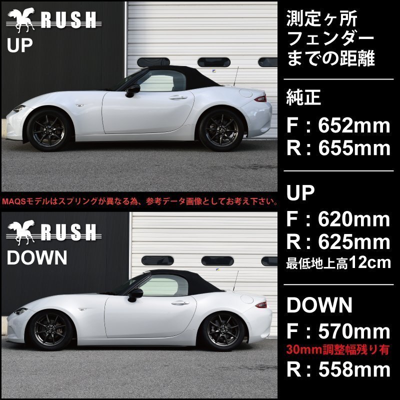 | 調 整 幅 | : | F -32mm〜-82mm / R -30mm〜-97mm ※MAQSモデルはスプリングが異なる為、調整幅も異なります |