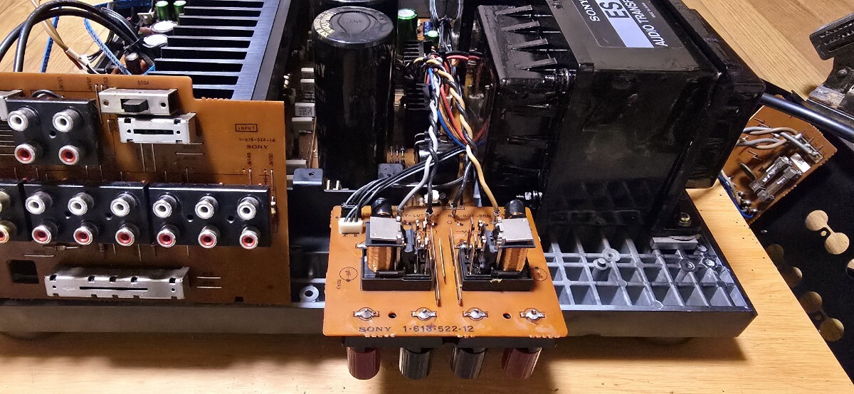 | 商品説明 | ●末永く修理、メンテナンスをさせて頂きますので、安心してご入札してください! ●今回、測定機器等、機材更新を実施したため、以前より精密に整備・調整が出来る様になりました。 ●交換部品はストックしてあるため、長期的に対応出来ます。 ●このアンプは、純正本来の高音質変化/劣化を避けるために、なるべくハンダは溶かさず特殊な方法で、メーカーサービスマニュアルに従い整備を実施してあります。 ※即ち、入力切替スイッチ等、ハンダを溶かして分解せずに整備、高音質を再現しています。 ●説明 以下、当方の定型文に手を加えての簡易説明になります。 必ず最後までお読みください。 ※SONY TA-F555ESXⅡ ¥128,000(1987年発売) ※1987年当時オーディオ雑誌・FMfan誌のダイナミックテストの評価コメントで故長岡鉄男氏は、 「本機のツイントランスはサイズからいくと、30万円のパワーアンプ級といえる。 内部パーツもオーディオ用の高品位の物を使用、ボリュームも国産アルプス社製高級機タイプを採用と贅沢の限りを尽くし、手抜きがまったくない。 音は空間の枠組みが非常にしっかりとしており、ゆらぎやふらつきが無く、実に安定した構成力の確かなサウンド、低域の音程も明快、ダンピングが特に良い、パワフル、レンジも広く、安定感のある素晴らしいサウンド、ゴリゴリと押し出してくるエネルギー感、重量感は格別、圧倒的にコストパフォーマンスが高い」 と高評価した傑作プリメインアンプです。 (当時の雑誌からコメント抜粋掲載) ※TA-F555ESXⅡに使用されている国産 サンケン製パワートランジスターA1492/C3856(現在は生産中止品)は、国産ハイエンドメーカーのアキュフェーズ/Accuphaseのプリメインアンプにも採用されています。 ※TA-F555ESXⅡは贅沢に物量投入することが出来たバブル全盛期当時(1986年~1992年)の傑作アンプです。 ※このシリーズ 後の系譜 ①TA-F555ESR(1988) ②TA-F555ESG(1989) ③TA-F555ESL(1990) ④TA-F555ESA(1991) ⑤TA-F555ESJ(1992)の最終モデルで555シリーズは生産終了となります。 ●スペック ※TA-F555ESXをベースに、亜鉛ダイキャストのカバーで固めた国産バンドー社製ツイントランスを採用、パーツレイアウトを見直す、などの改善が施されたプリメインアンプTA-F555ESXⅡです。 ※シリーズ中最強・最高峰・最重量級アンプで、質量の大半は重量級の日本製バンドー社ツイントランスが占めており、総質量は27.8kgとシリーズ最重量アンプで重厚な佇まい ※無振動・無共振設計の理想を追求し、素材の選定や形状及び構造を徹底追及したアコースティカリーチューンドG(ジブラルタル)シャーシを採用 ※MCカートリッジに対応したフォノイコライザーアンプには、高域応答特性に優れ、TIM歪を追放するローノイズHi-gmFETを採用、MM/MC40Ω/MC3Ωの3ポジションのカートリッジロードセレクターを搭載 ※電源部にはS.T.D.(Spontaneous Twin Drive)電源を採用 ※ブロックコンデンサを一体型のバイブレーションプルーフプラットホームで締め付けることで振動を追放 ※TA-F333ESXⅡとの差別化で、天板の塗装はコストの掛かる梨地仕上げ ●外観 ※目立った傷はなく、綺麗な状態の個体です。 ●内外装部共にフルノーマル状態の美品機に仕上げましたが、38年前のアンプの為、使用頻度は不明です。 ※見た目は綺麗でも、古い機種なので、決して「★使用僅少」「使用頻度の少ない」の状態ではありません。 ※古い工業製品は不特定多数の人達の手を渡り使用されているのが通常で、車の様に物的証拠を提示出来るオドメーター/走行距離表示の機能が無いため、常識的に考えて「使用頻度不明」が正しい表記になります。 ★使用僅少、徹底分解メンテナンス済、タイトル詐欺にご注意を! ●整備内容 ※以下、サービスガイドに従い整備を実施してあります。 1、徹底分解後内部埃の除去・清掃 2、各基盤洗浄(ハンダフラックス除去) ※画像参照 3、DC0Vオフセット値調整 ※画像参照 4、バイアス値をメーカー規定値15mVに調整 ※画像参照 5、ヒューズ抵抗値点検 ①100Ω→103Ω ②120Ω→129Ω ③470Ω→476Ω ※抵抗値の変動は少なく、優秀機です。 ※ヒューズ抵抗はウィークポイントで、経年劣化で抵抗切れ若しくは抵抗値上昇で必ず音質が低下します。 規定値であれば本来の高音質は再生可能。抵抗値が上がるとぼやけた音質で、本来の性能が発揮されません。 ※他の出品者様の整備済みアンプで、このヒューズ抵抗値の確認がされていないのも見受けられますが(説明文では点検済みと、画像無しで偽掲載)、後々故障して被害が大きくなる場合があり、高額の修理費用が発生します。そのため、値の高いヒューズ抵抗は交換が必要になります。 6、各パネル取り外して清掃 7、ボリューム、バランス、トーン、ミューティングスイッチ、ダイレクトスイッチ、入力切替接点、各切替接点、RCA端子、ヒューズ2個、電源プラグにケイグ処理 ※ウィークポイントの1つである、バランスボリューム不良(内部結線切れ)もありません。 8、RC