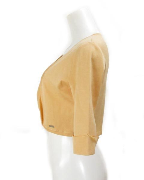 | 落ち着きのある黄色のニットボレロ。シンプルデザインなので、流行に左右されず長く着て頂けます。ワンピースやフレアースカートなど、大人フェミニンなスタイルで、活躍してくれます。 |
