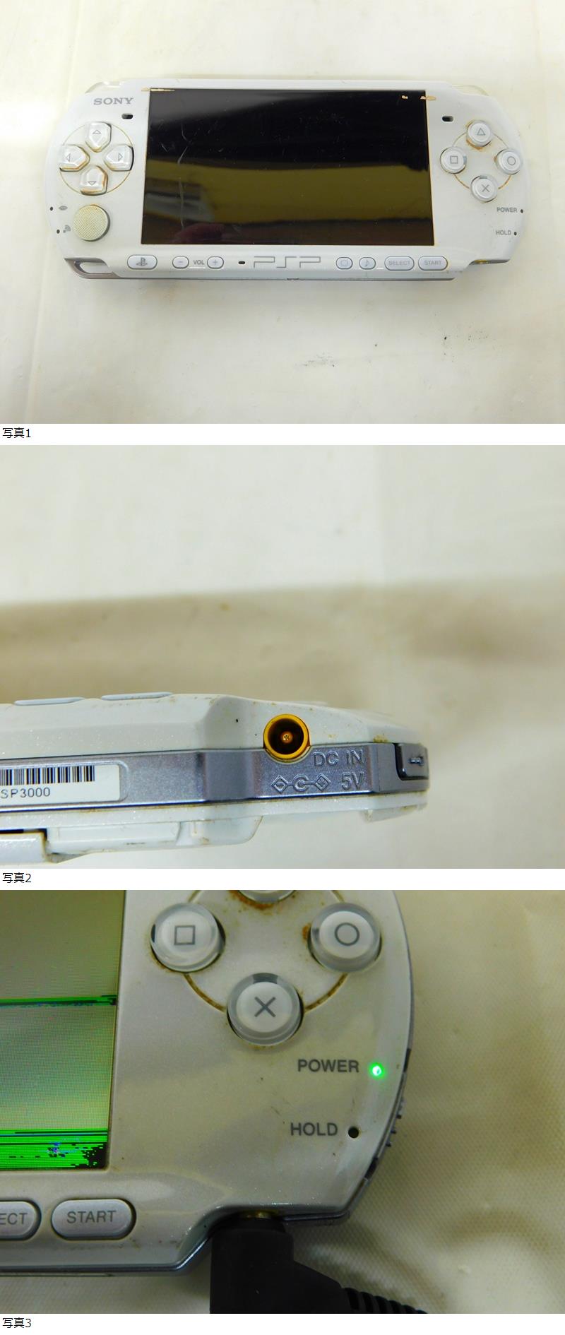 1、 商品名 PlayStation Portable ・型番 SPー3000 ・色 ホワイト系 ・充電アダプターを差しての電源ランプは 点灯【○】 ・付属バッテリーのみでの電源ランプは 点灯 【×】 ・電源が入ったときの画面表示は 【ありました。】 ・確認用ソフトでゲームが 【できました。】 ・欠品箇所・・・バッテリー、蓋 ・気づいたこと・・・画面に黒くなっている部分があります。