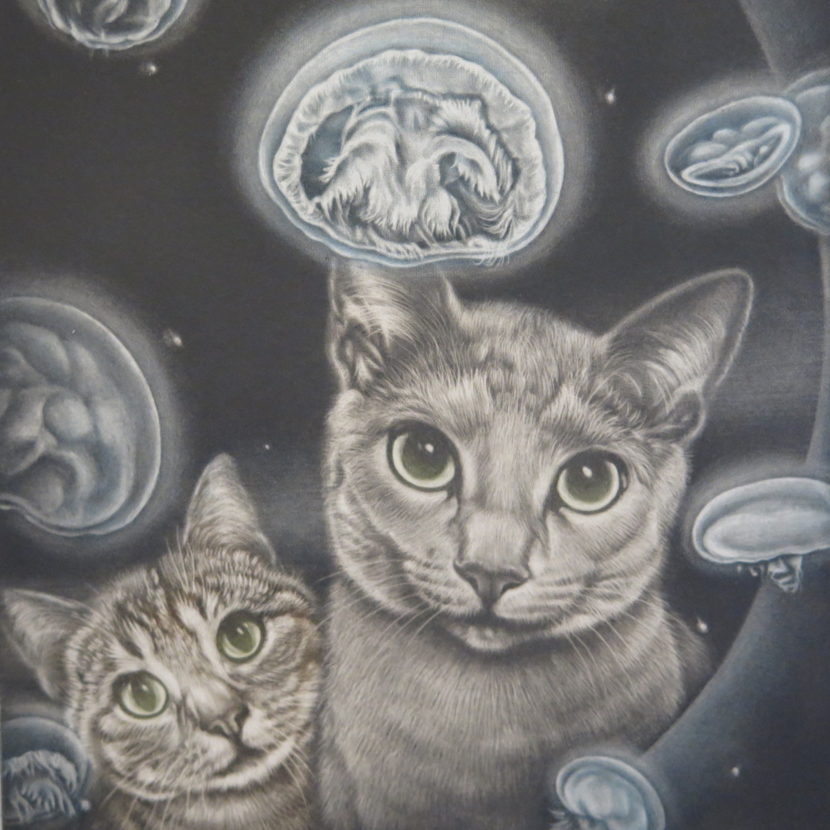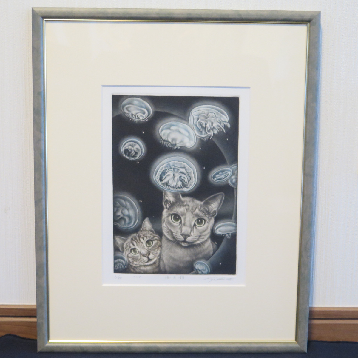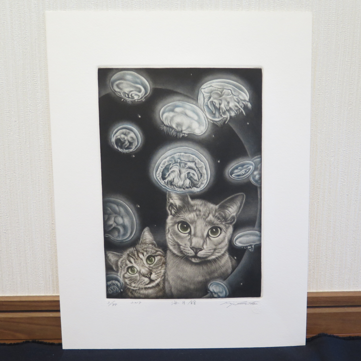 作品は【 海月館 】クラゲを眺めるかわいい猫2匹。稀少なカラー作品、個展に於いて作家本人からの購入です。カラーメゾチント。画面23.7*16.4㎝(2号大)。画面にサイン、エンボス、タイトル、限定エディション3/75、年記2017。シートサイズ34.9*26.4㎝(フルマージン)。状態は良好です。額装サイズ45.8*36.7*2.3㎝。前面はアクリルで総重量1㎏と軽量、簡単・安全に飾っていただけます。保管状態極めて良好、使用感なく未使用に近い極美品です。かぶせ箱が付属します。