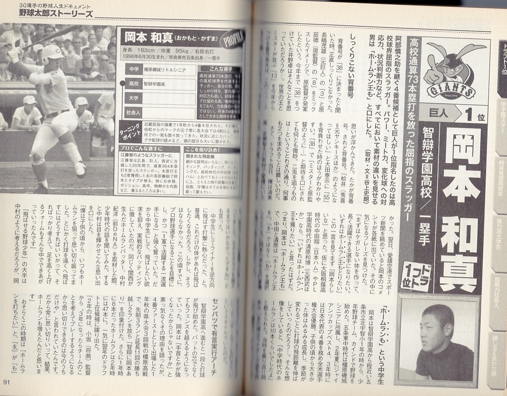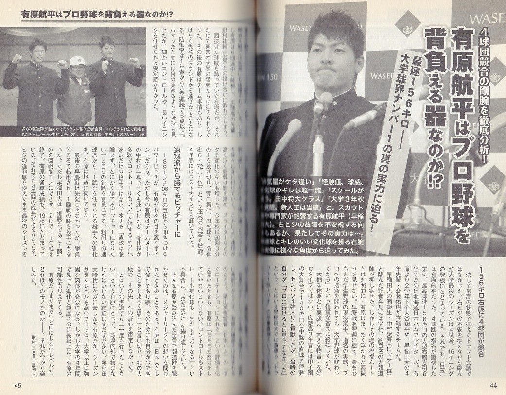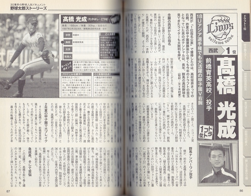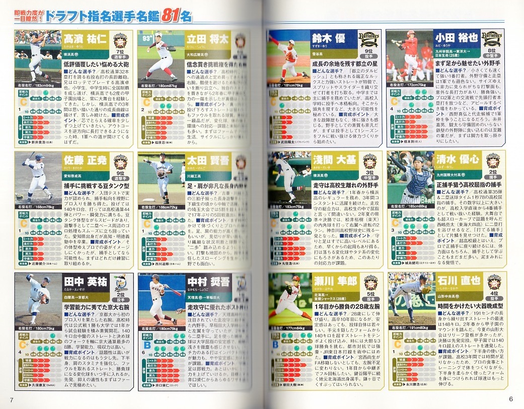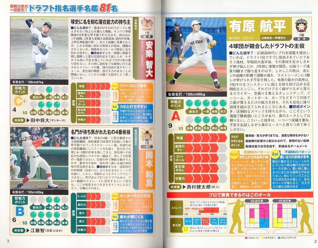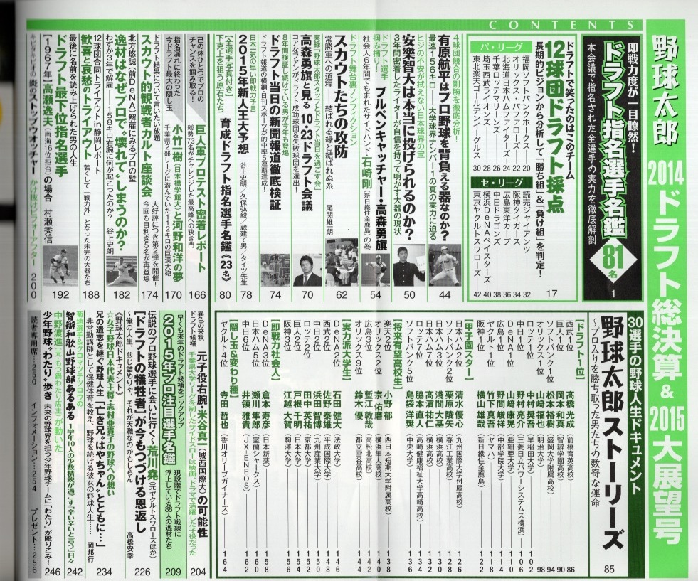 | 【即戦力度が一目瞭然! 】ドラフト指名選手名鑑《81名》 育成ドラフト指名選手名鑑《23名》 【ドラフト戦線に浮上する逸材たち】2015年プロ注目選手名鑑《88名》 プロ野球12球団ドラフト採点 有原航平はプロ野球を背負える器なのか? 大学球界ナンバー1の真の実力に迫る 安樂智大は本当に投げられるのか? 3年間密着したライターが自信を持って明かす大器の現状 ドラフト選手掴み捕り! ブルペンキャッチャー・高森勇旗〜石崎剛(新日鐵住金鹿島) ドラフト舞台裏ノンフィクション スカウトたちの攻防 高森勇旗と見る 10・23ドラフト会議 ドラフト当日の新聞報道徹底検証 2015年新人王大予想 ~プロ入りを勝ち取った男たちの数奇な運命 西武1位・髙橋光成(前橋育英高) 巨人1位・岡本和真(智辯学園高) ソフトバンク1位・松本裕樹(盛岡大付高) オリックス1位・山﨑福也(明治大) ロッテ1位・中村奨吾(早稲田大) 中日1位・野村亮介(三菱日立パワーシステムズ横浜) DeNA1位・山﨑康晃(亜細亜大) 広島1位・野間峻祥(中部学院大) ヤクルト1位・竹下真吾(ヤマハ) 阪神1位・横山雄哉(新日鐵住金鹿島) 日本ハム2位・清水優心(九州国際大付高) ソフトバンク2位・栗原陵矢(春江工高) 日本ハム3位・淺間大基(横浜高) 日本ハム7位・髙濱祐仁(横浜高) ロッテ7位・脇本直人(健大高崎高) ソフトバンク5位・島袋洋奨(中央大) 楽天2位・小野郁(西日本短大付高) オリックス2位・宗佑磨(横浜隼人高) 広島3位・塹江敦哉(高松北高) オリックス9位・鈴木優(雪谷高) DeNA2位・石田健大(法政大) 西武2位・佐野泰雄(平成国際大) 中日2位・浜田智博(九州産業大) ロッテ2位・田中英祐(京都大) 巨人2位・戸根千明(日本大) 阪神3位・江越大賀(駒澤大) DeNA3位・倉本寿彦(日本新薬) 日本ハム5位・瀬川隼郎(室蘭シャークス) 中日6位・井領雅貴(JX-ENEOS) ヤクルト4位・寺田哲也(香川オリーブガイナーズ) 巨人軍プロテスト密着レポート 指名漏れに終わった今ドラフト最大の隠し玉 小竹一樹(日本橋学館大)と河野和洋の夢 今回も目利き5名が再登場「スカウト的観戦者カルト座談会」 北方悠誠(前DeNA)解雇にみるプロの壁 12球団合同トライアウトin静岡レポート 歓喜と哀愁のトライアウト ドラフト最下位指名選手【1967年】高瀬逸夫(南海16位拒否)の場合 炎のストップウオッチャー かけ抜けビフォーアフター 異色の来秋ドラフト候補 元子役右腕・米谷真一(城西国際大)の可能性 伝説のプロ野球選手に会いに行く~荒川堯(元ヤクルトスワローズほか) 女子野球日本代表主将・志村亜貴子の野球への想い 兄の遺志を継ぐ野球人生 「亡き兄“はやちゃん"とともに…」 菊地選手&クロマツテツロウの智辯和歌山野球部あるある 中野渡進(元・もつ鍋わたり店主)が動いた 少年野球“わたり"歩き | |||
