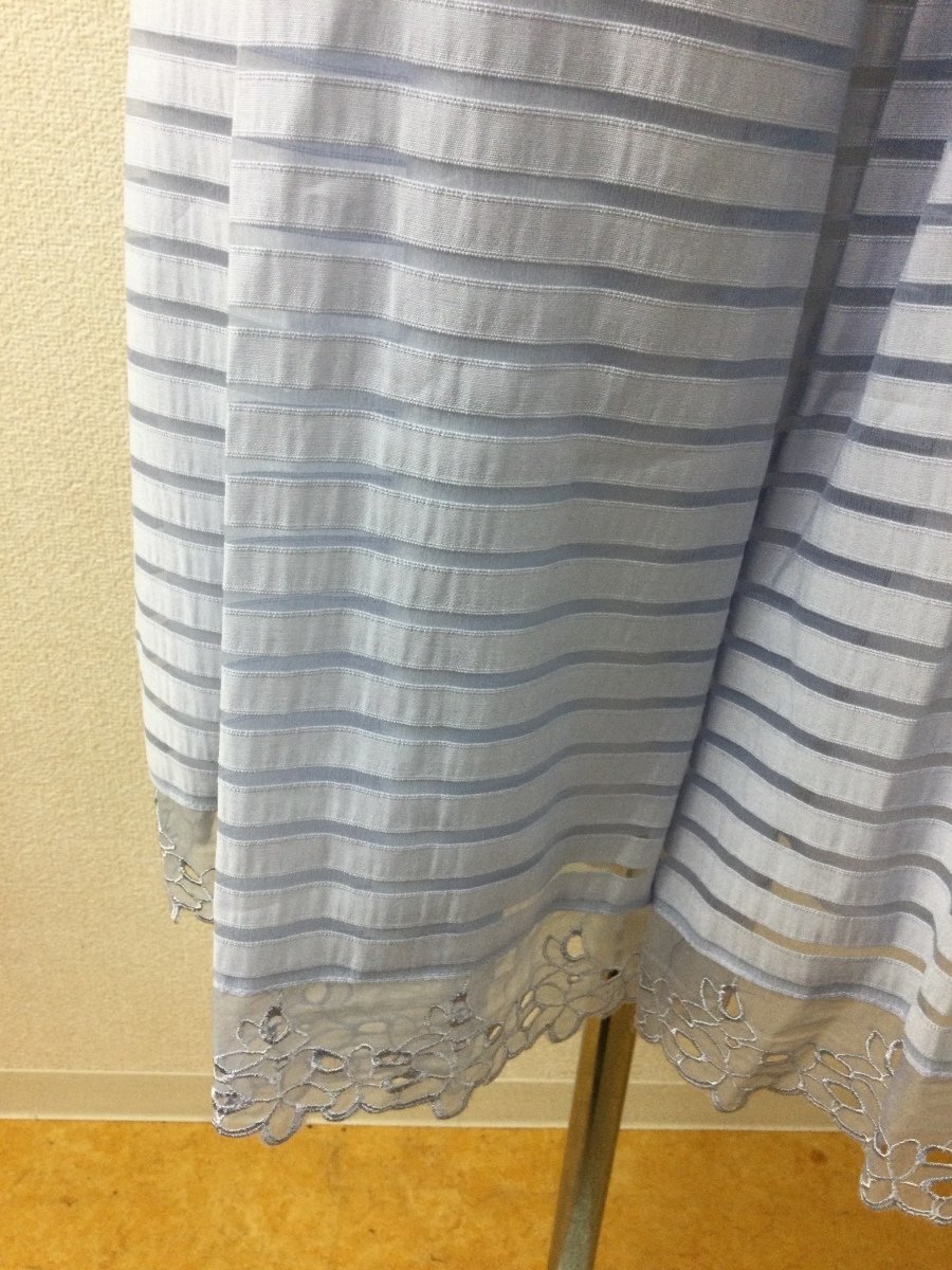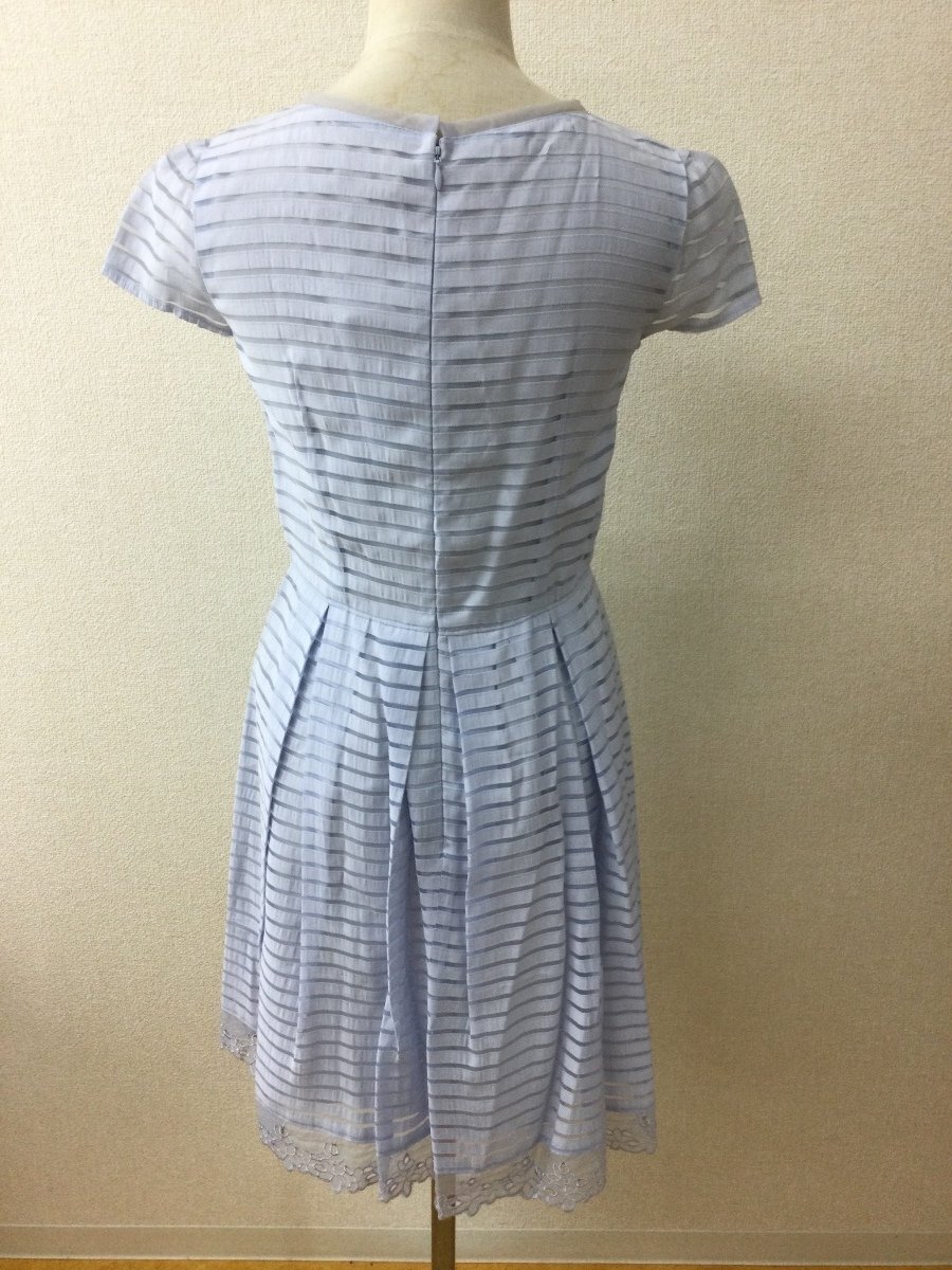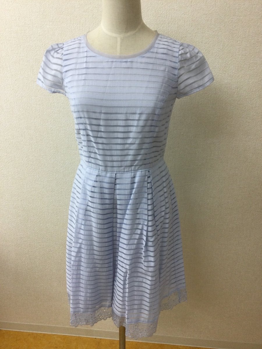 | 管理番号:10^135058 レストローズ タグ付き未使用 パステルブルー シアーボーダーワンピ 表示サイズ:MT 実寸(参考)