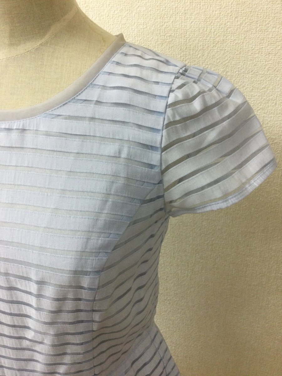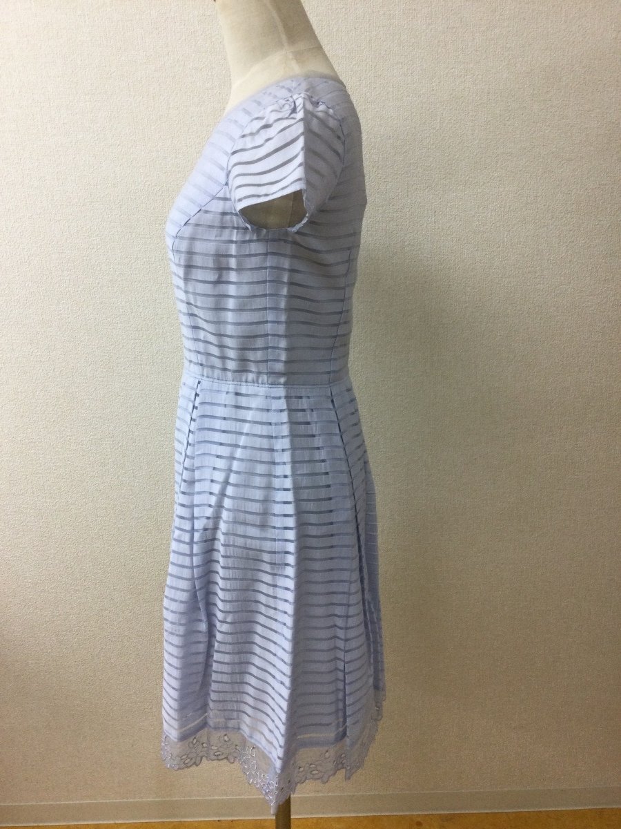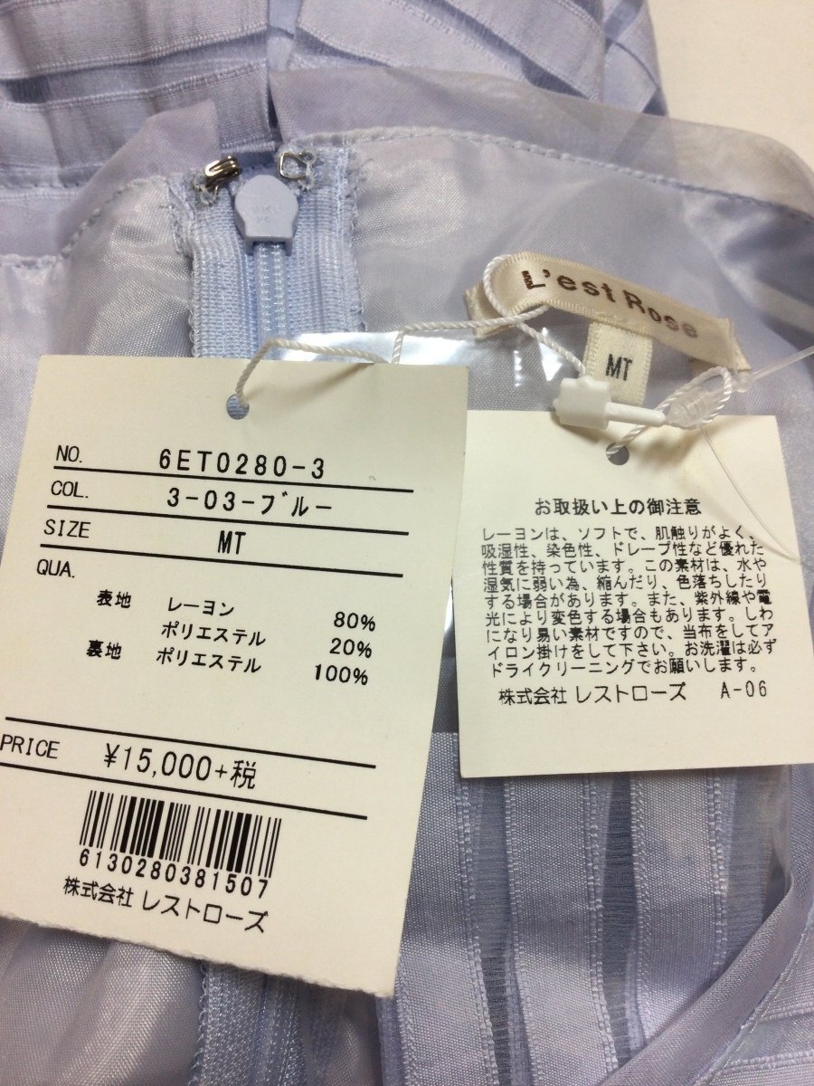 | 管理番号:10^135058 レストローズ タグ付き未使用 パステルブルー シアーボーダーワンピ 表示サイズ:MT 実寸(参考)