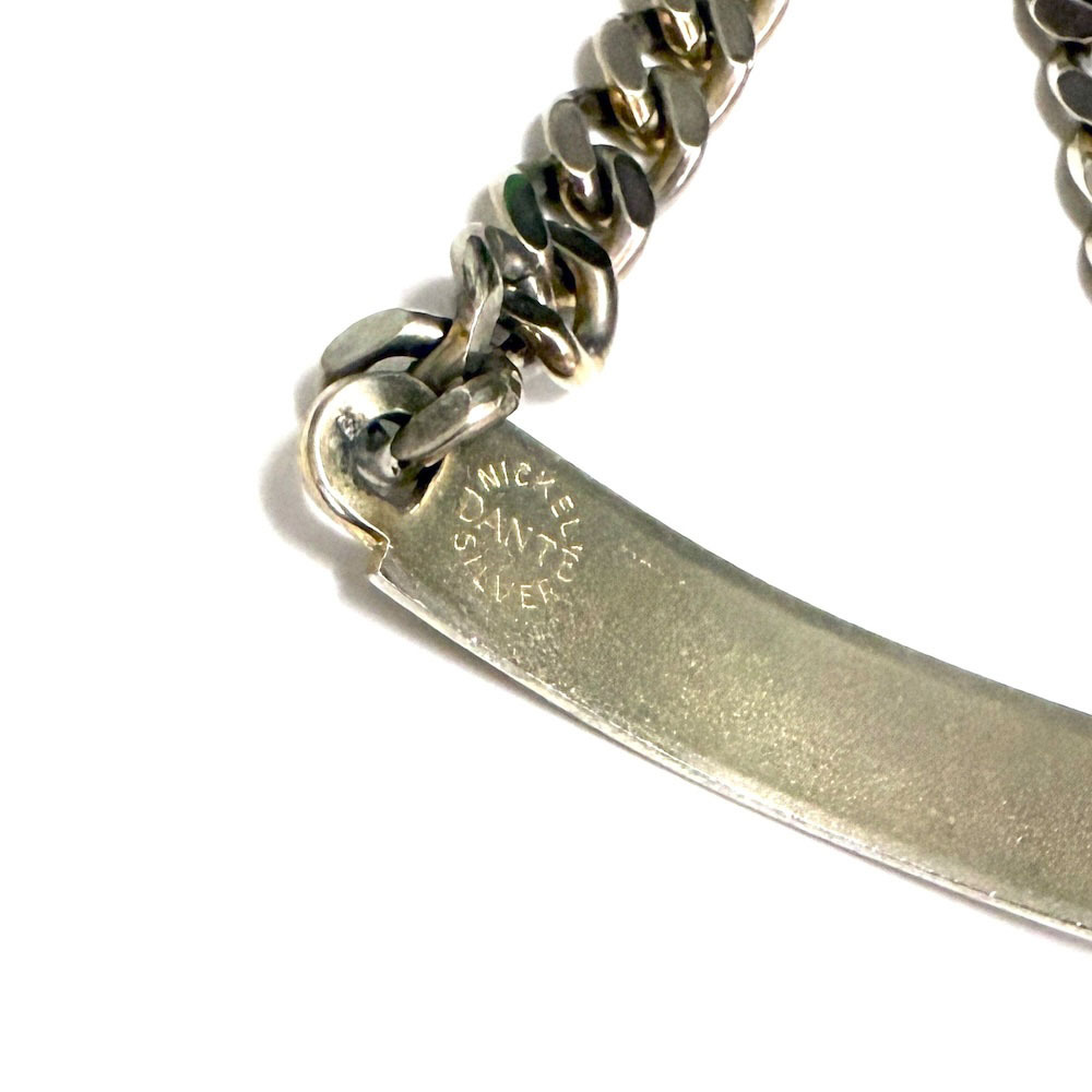 USEDのvintage ニッケルシルバー IDブレスレットです。シルバーと遜色ないニッケルシルバーで作られたブレスレット。程よい重厚感でスタイリングにスパイスを与えてくれます。| 出价者 | 信用 | 价格 | 时间 |