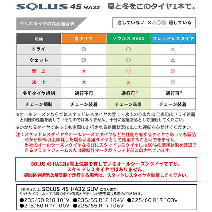 | ご覧いただき誠にありがとうございます。 お急ぎの場合は入札前に質問欄で予定に間に合うかどうかの確認をしてください。 迅速、丁寧を心掛けております。ご安心して取引ください。 タイヤメーカー:クムホタイヤ ソルウス 4S HA32