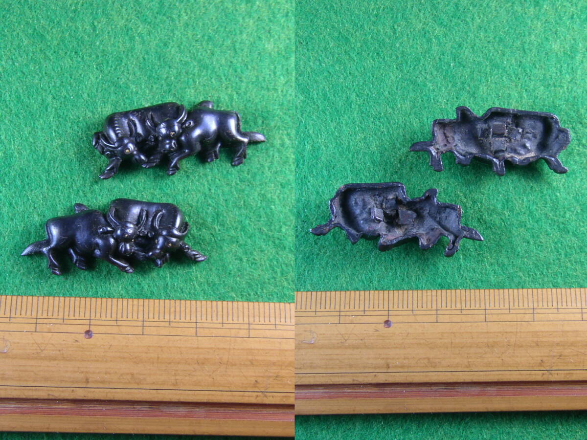 江戸時代の「後藤」の作に通じる出来栄え上々の「双牛の図」の目貫ですから 当然の事として「使用感・経年感」はありますが 当方見る限り出来栄え保存状態共に上々で問題になる傷みは有りません。