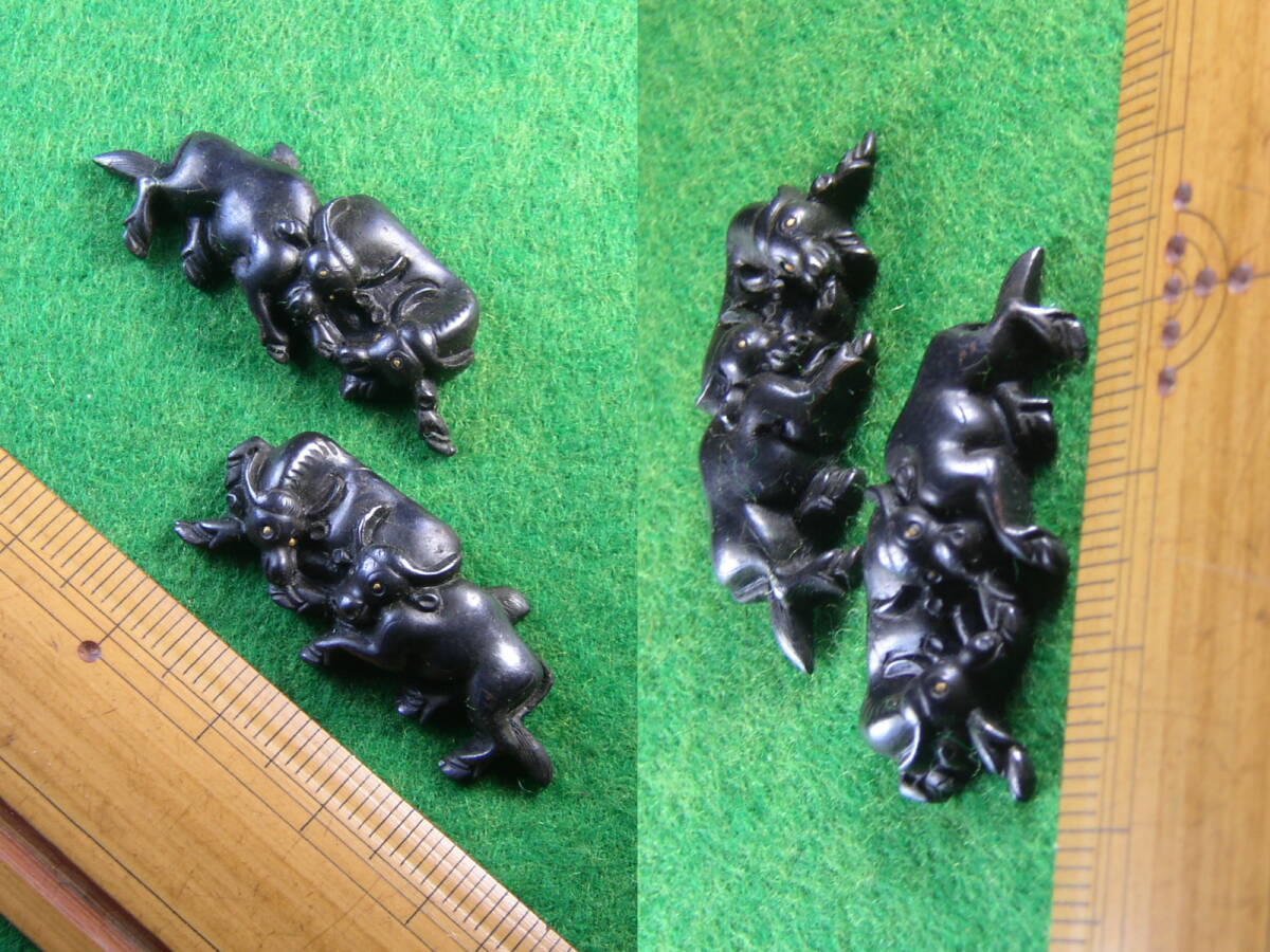 この度の「目貫」は「双牛の図」で黒々とした良質な赤銅地を裏から強く打ち出し高彫りし毛彫を入れ「眼」には金点象嵌を丁寧に施し「牛」の躍動的で動きある姿態を見事に表現し入念に彫り