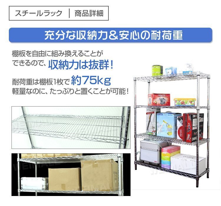 | \どんなお部屋にも合わせやすいスチールラックです/ クギやネジを使わずに簡単に組み立て出来ます! 棚の高さを自由に変えることができます。 一人暮らしのお部屋やリビング、キッチン、物置など場所を問わず活躍できます。 アパレルショップの店頭用やオフィスにも使用されています。 ぐらつき防止アジャスター付き! ■商品コード:MR12AD5 ■商品仕様 サイズ(約):幅120×奥行30×高さ180cm 耐荷重(約):(全体)375kg / (棚板1枚あたり)75kg 材質:スチール(クロームメッキ)、ABS樹脂他 重量(約):15.2kg ■内容 シェルフ(棚板) ×5 ポール(ジョイント式) ×4 棚板固定部品 ×20(+予備付属) 標準アジャスター(固定足) ×4 ■注意事項 ・海外製品で、簡易梱包での輸入のため風防に擦れや多少の小キズなどがある場合がございますが、 商品自体には問題ありませんのでご了承下さい。 ・商品は、モニターによって色合いが異なって見える場合があります。 ・仕様・デザインは改良のため予告なく変更することがあります。 ■保障期間 7日間 ※商品到着後7日以内の初期不良・破損のみご対応させていただきます。 【新品未使用品です】 |