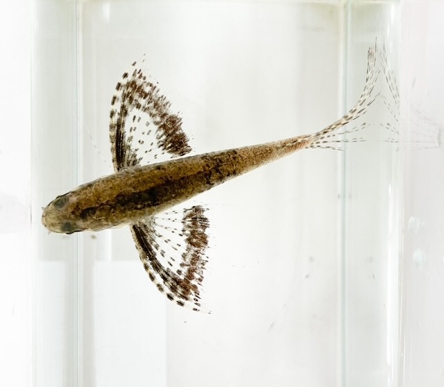 バタフライフィッシュはアロワナ目パントドン科パントドン属に分類される淡水魚で、1種で1科1属を形成している珍しい魚種です。分類から分かる通りアロワナ類とは近縁の関係にある古代魚で、魚体の形はアロワナとよく似て側扁しており、口は上向きについています。大きさは成魚でも10~15cm程度と古代魚としては小型で、発達した胸ビレと伸長する尾ビレ、鰭条がよく伸びる腹ビレが独特なフォルムを生み出しています。体色は褐色を基調に、ヒレを含む魚体には暗色の斑点が散在しています。