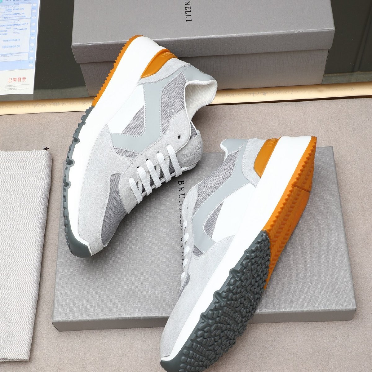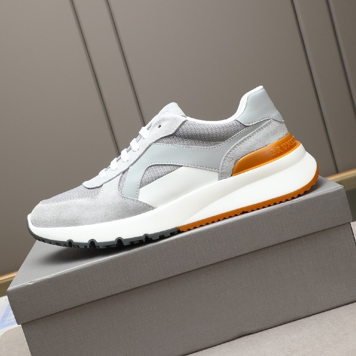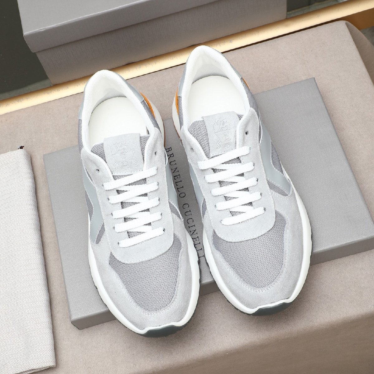 洗練されたデザインと贅沢な素材使いが特徴的なBrunello Cucinelliのスニーカー。上質なイタリア製カーフレザーとメッシュ素材を組み合わせた、スポーティーでありながらラグジュアリーな一足です。ライトグレーをベースに、グレーとオレンジのアクセントカラーが効いた洗練されたカラーリング。通気性に優れたメッシュ素材と柔らかなカーフレザーの組み合わせで、快適な履き心地を実現。白いミッドソールとオレンジのアウトソールがモダンな印象を与え、カジュアルからスマートカジュアルまで幅広いスタイリングに対応。TPU素材の一体成型ソールは耐久性に優れ、安定した歩行をサポート。イタリアならではの職人技が光る、細部まで丁寧に作り込まれたプレミアムスニーカーです。