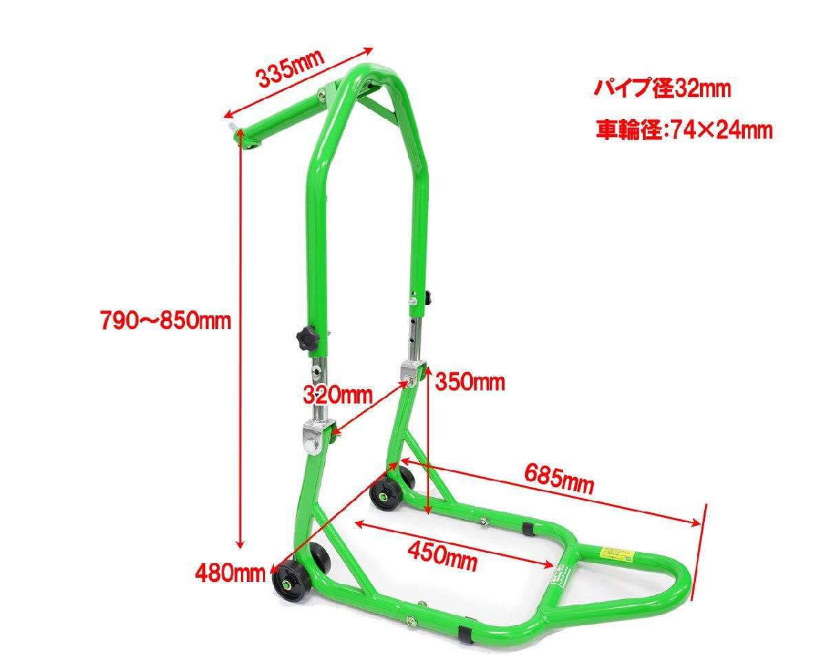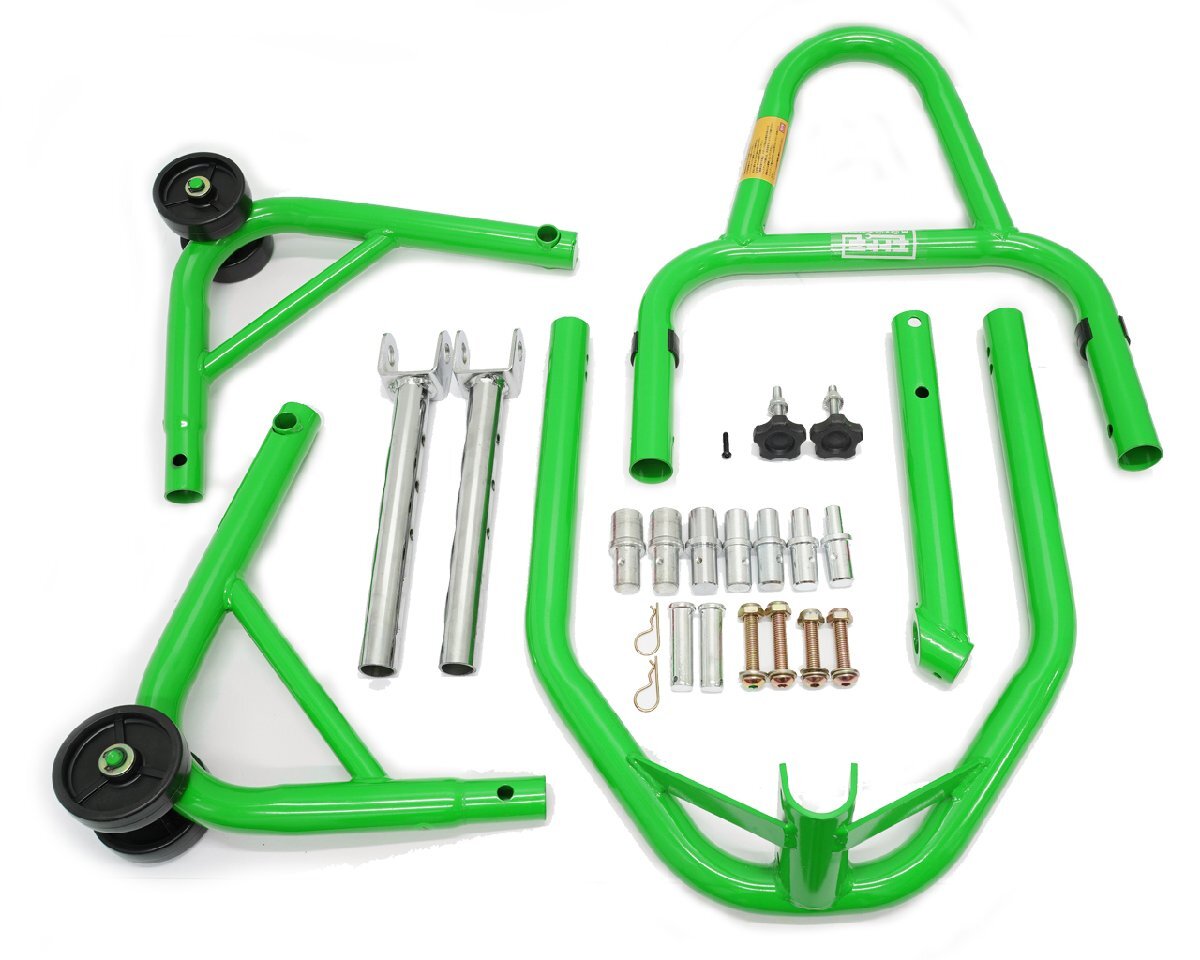 | フロントスタンド バイクスタンド 高さ5段階調整付き アタッチメント7種類 メンテナンススタンド フロント 専用51603-1G グリーン カワサキ車にお似合いです♪ |