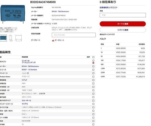 ★EPCOS/TDKの汎用高耐圧フィルムコンデンサ0.47uF/1.5KV(1500V)dc/300Vac/20%/-40℃~110℃/12個セット★パワエレ回路/民生電子機器/共振型インバーター/高電圧電子回路/真空管アンプ/試作研究開発等に★電気安全規格PASSなのでAC電源ラインEMIフィルタ使用可能★製品詳細はhttps://www.digikey.jp/ja/products/detail/epcos-tdk/B32024A3474M000/1648126を参照ください★ ★★状態は写真を十分ご確認ください★ 不明点等ありましたなら遠慮なくご質問いただきご納得の上にご入札お願いします★店舗販売品と同等の状態を期待される方や色々気になってしまう方や神経質な方のご入札はご遠慮ください★オークションルール上ご入札後のキャンセルはお受け出来ませんので十分にご納得の上ご入札お願いします★ |