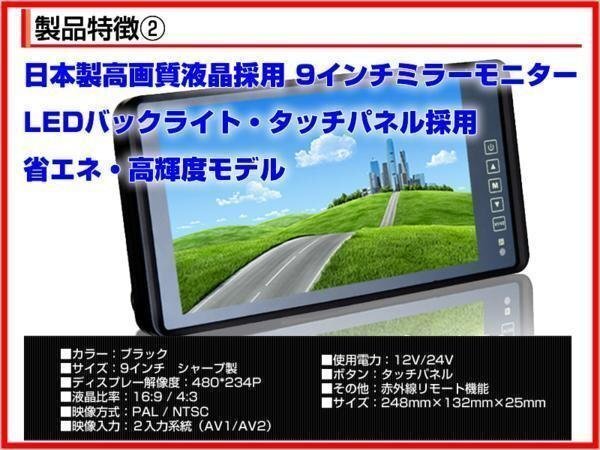 | 液晶サイズ:9インチ 画素数:480×234 消費電力:6W 映像入力端子:RCA2系統 映像入力切替機能:1系統のみバックギア連動可能 定格電圧:DC12V / DC24V 本体サイズ:横248mm × 高さ132mm × 奥行25mm |