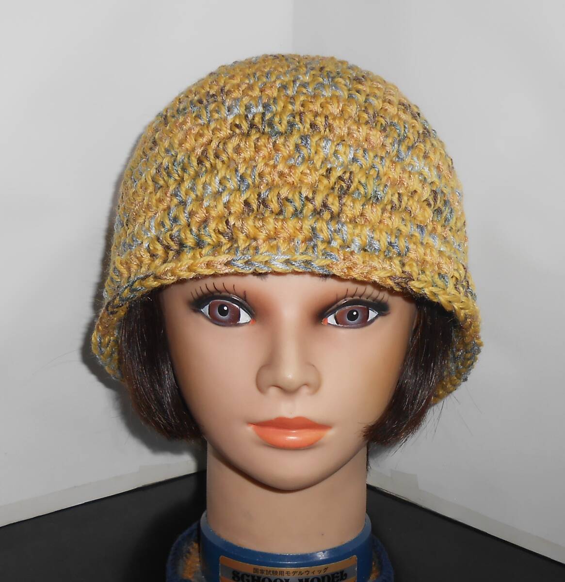 クラッシャー・バケット・クロシェハット【男性女性可能】 *黄/ウール並太毛糸・・・段染め/ポリエステル毛糸 2本取り編み *出来上がったばかり *帽子 サイズ・高さ約23㎝・頭囲約60㎝<モデルの頭囲は 56㎝です> つば先回りサイズ約64㎝ *伸縮性はあります。